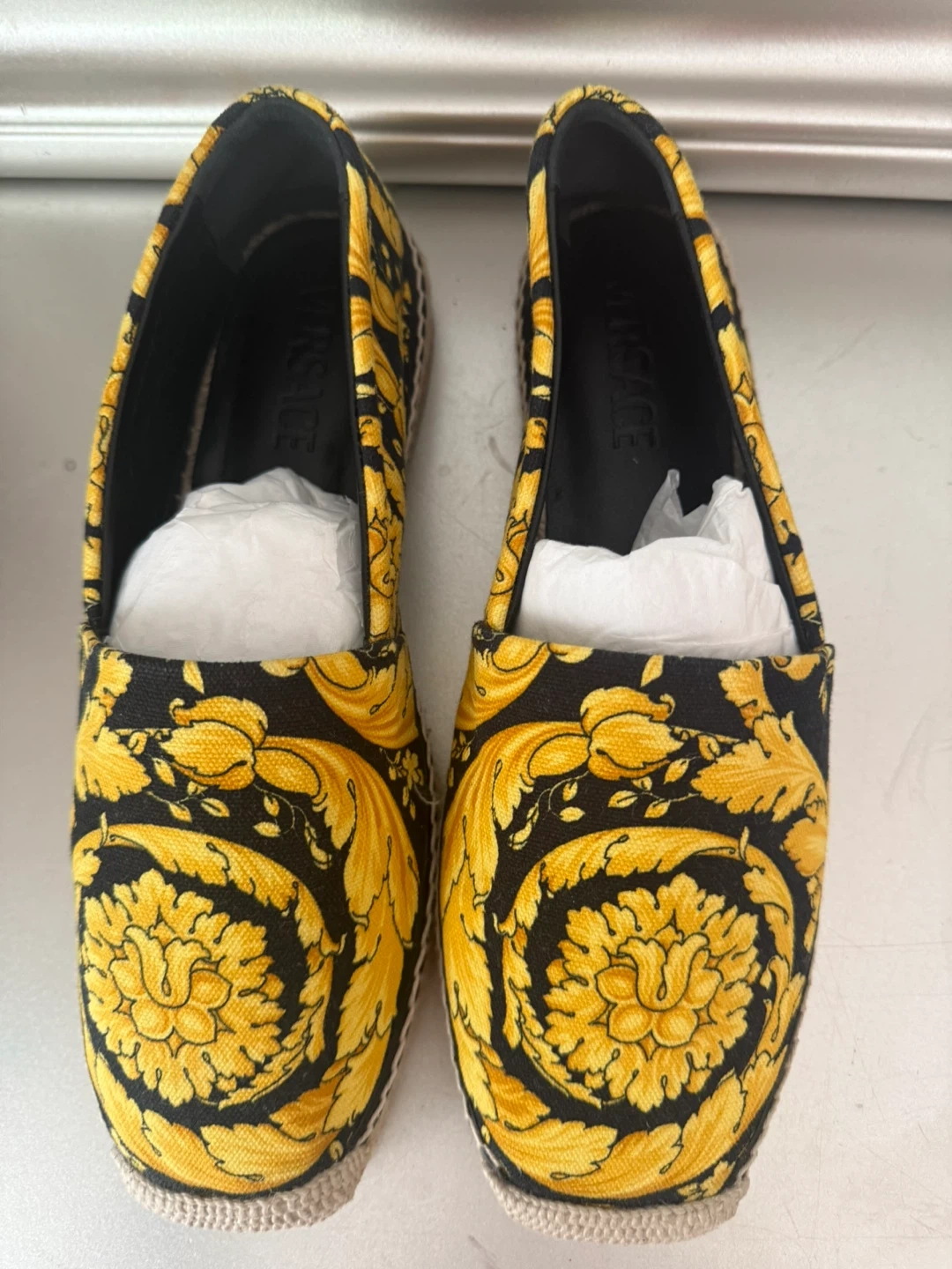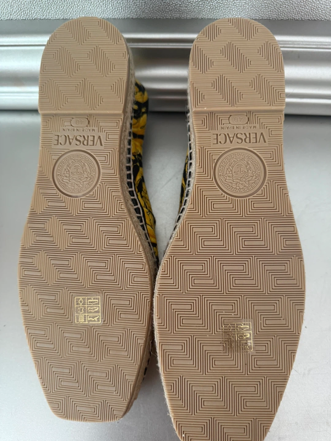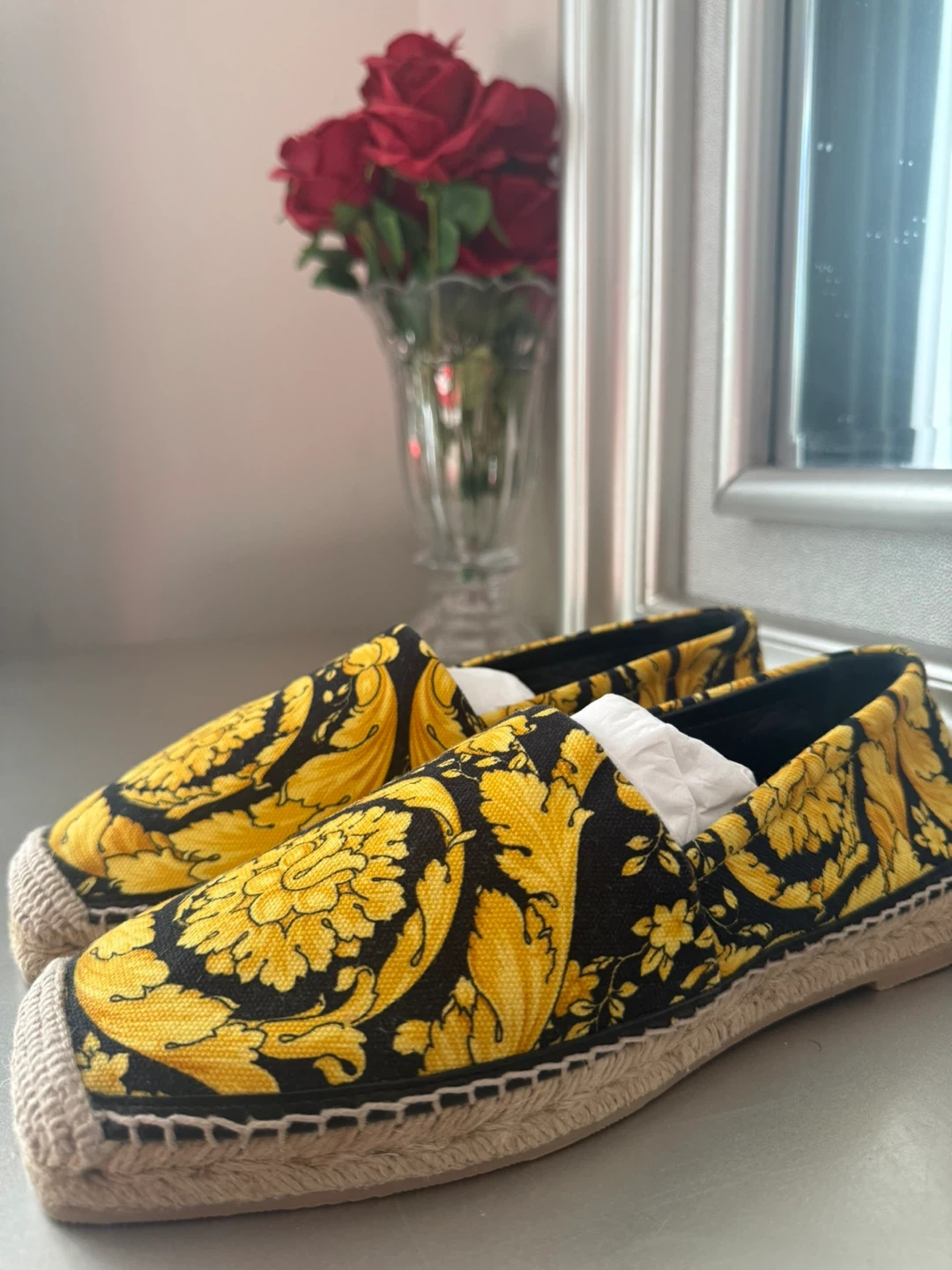 Authentic Versace espadrilles featuring the iconic black & gold Baroque print with braided jute sole.