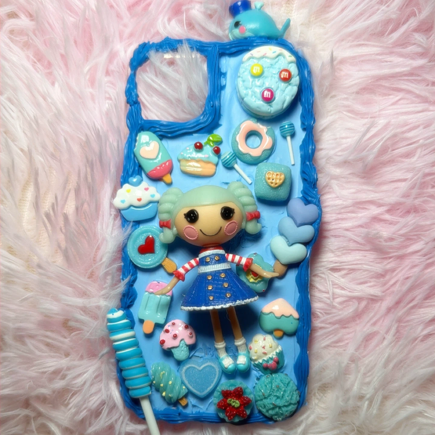 This is a custom blue phone case featuring a Lalaloopsy doll surrounded by various candy-themed charms. It has a playful and decorative design with sweets like cupcakes, donuts, and ice pops. The case is adorned with colorful accents and a small whale charm on top. It’s for the iPhone 15