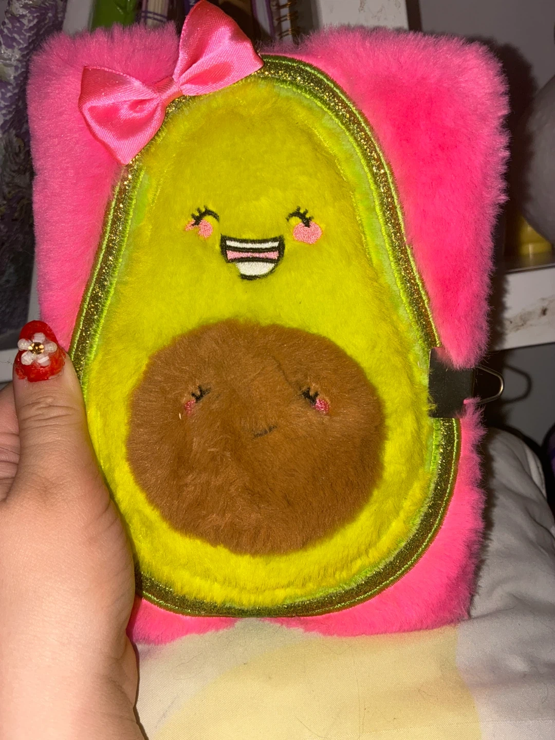 20Super cute avocado zipper pouch! It's fuzzy and plush, perfect for storing little things. The pouch is bright pink and yellow with a cute face and a pink bow and it’s never been used
