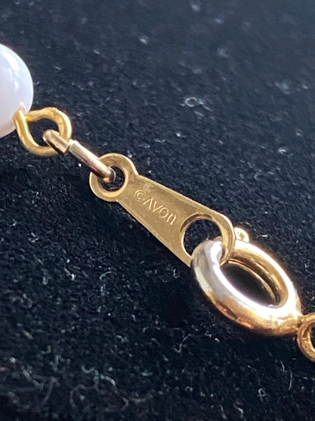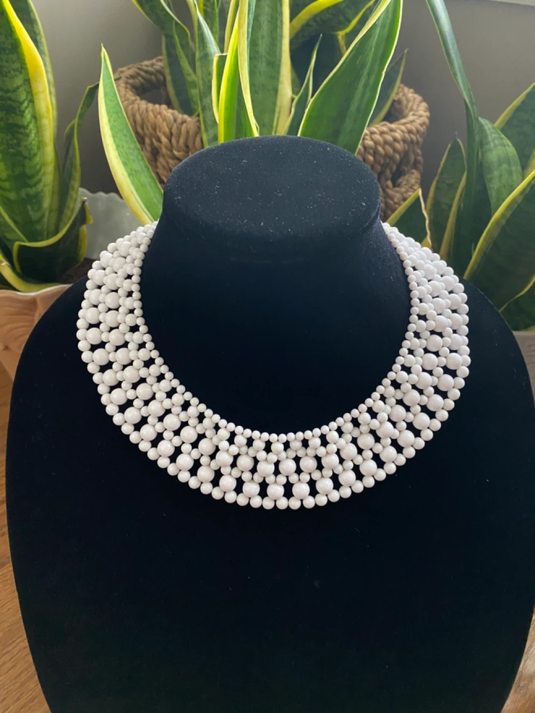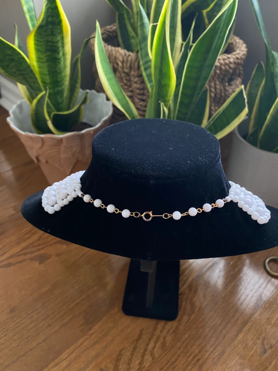Beautiful white beaded necklace from Avon! This multi-strand necklace is a classic piece that can add a touch of elegance to any outfit, fun to wear on a t shirt or sweater. The gold-tone clasp adds a nice contrast to the white beads. It's in great condition and ready to be worn. Measures 12 inches at the base of the throat with an additional 4 inch extender chain. Pre-owned and in very good condition. Happy to answer any questions.