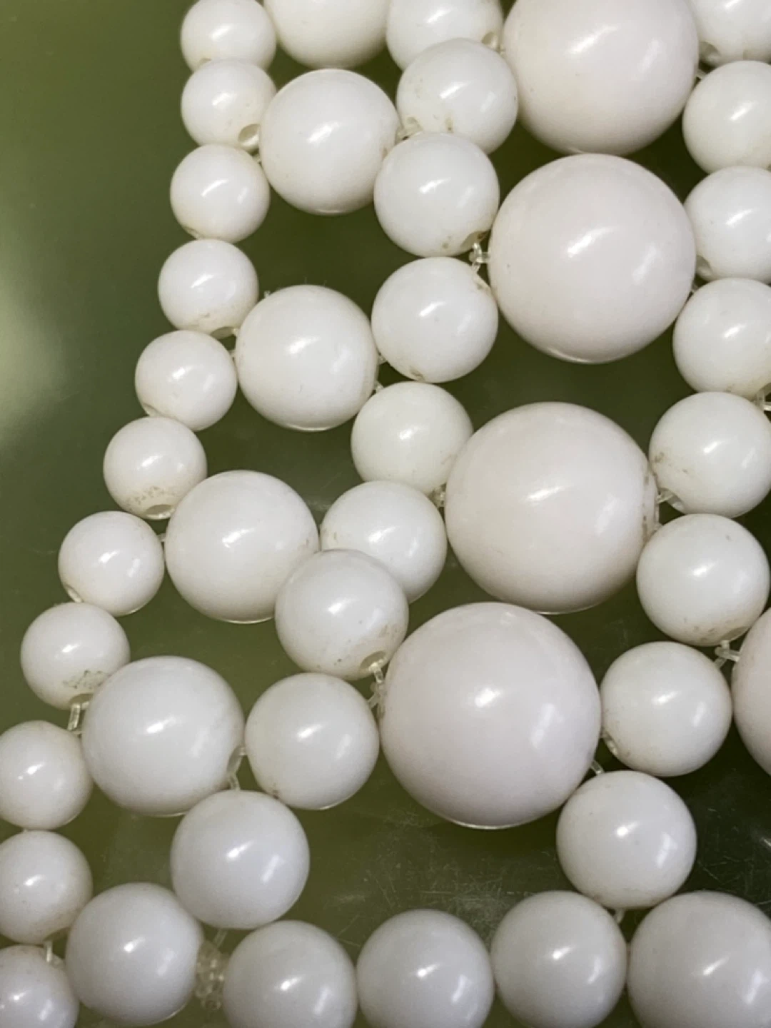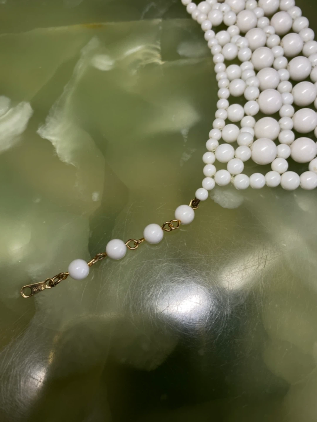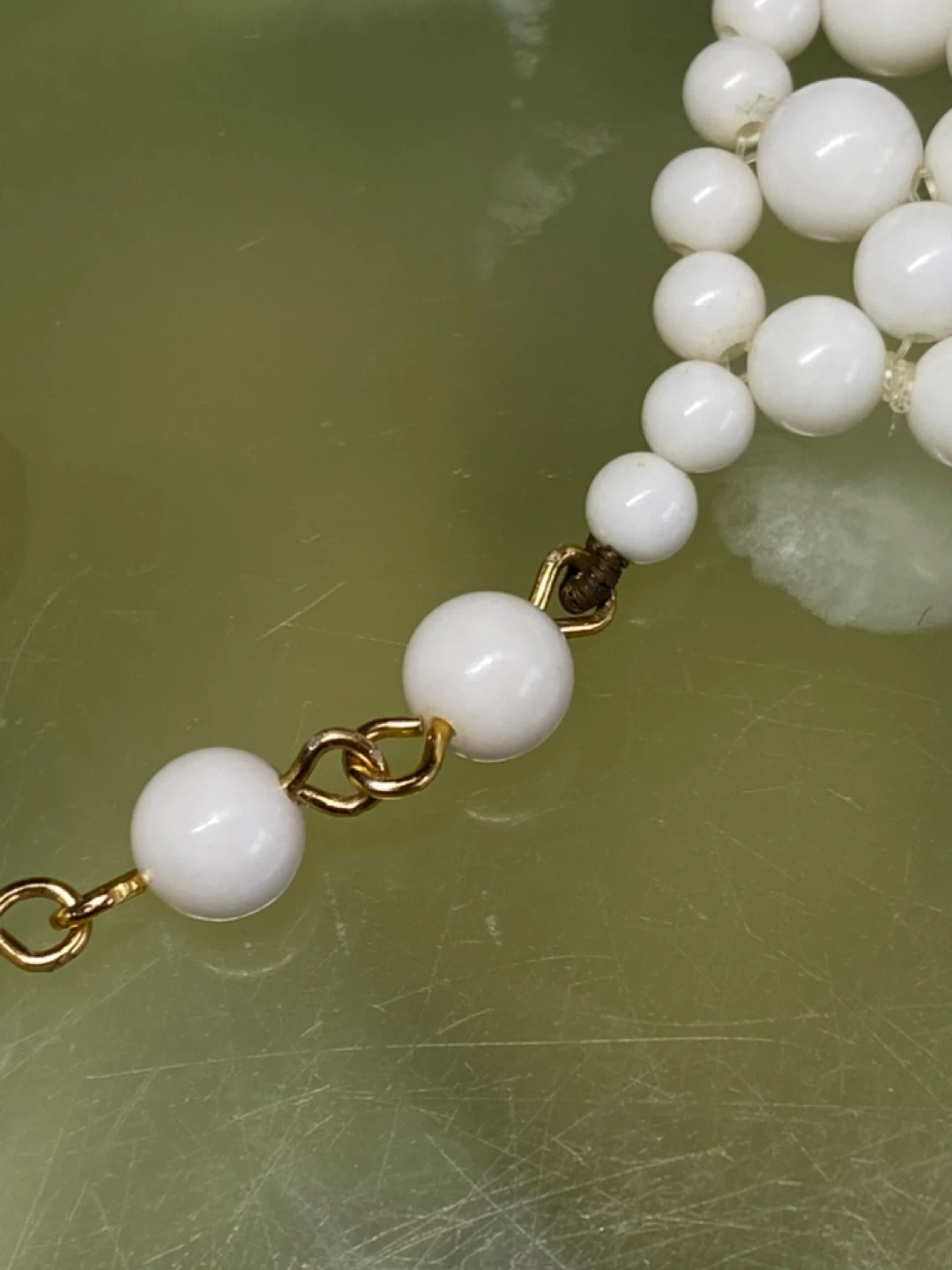 Beautiful white beaded necklace from Avon! This multi-strand necklace is a classic piece that can add a touch of elegance to any outfit, fun to wear on a t shirt or sweater. The gold-tone clasp adds a nice contrast to the white beads. It's in great condition and ready to be worn. Measures 12 inches at the base of the throat with an additional 4 inch extender chain. Pre-owned and in very good condition. Happy to answer any questions.