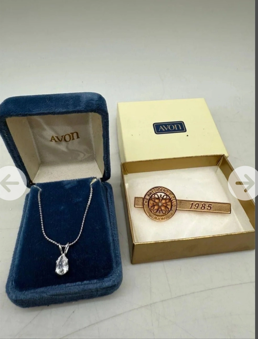 Avon Jewelry Lot (2 pcs) 1. Avon Necklace with Crystal Pendant – Elegant silver-tone chain with a teardrop-shaped clear crystal pendant. Presented in a vintage blue velvet Avon box. 2. Avon 1985 President’s Club Tie Bar – Gold-tone metal tie clip featuring “The President’s Club” emblem and engraved year “1985.” Comes in the original Avon box. Condition: Both pieces are in very good vintage condition. Included: Two original Avon presentation boxes. Cash Only Door Pick Up .