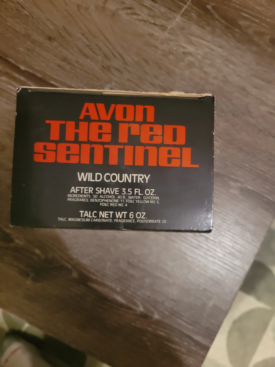 139Selling an Avon "The Red Sentinel" Wild Country after shave. It comes with the original box. The box indicates the after shave contains 3.5 fl. oz and the talc net weight is 6 oz. A great addition to any collection!