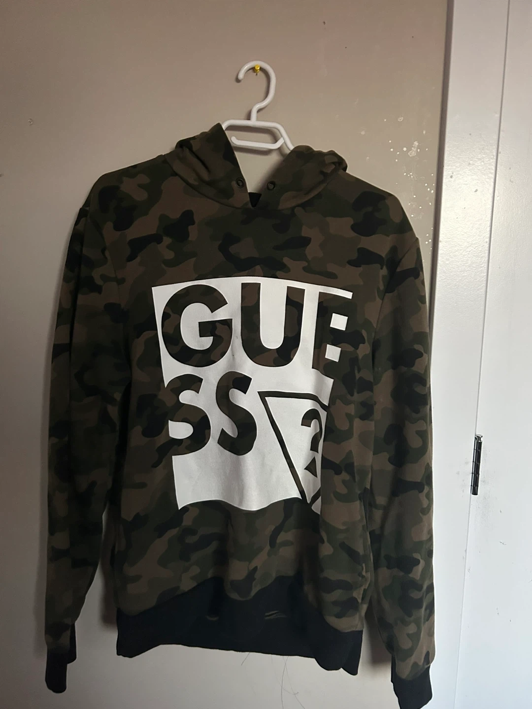 Selling a Guess camo hoodie! It features the Guess logo on the front and back. The hoodie is perfect for adding a stylish, casual layer to your outfit. Feel free to reach out if you have any questions!