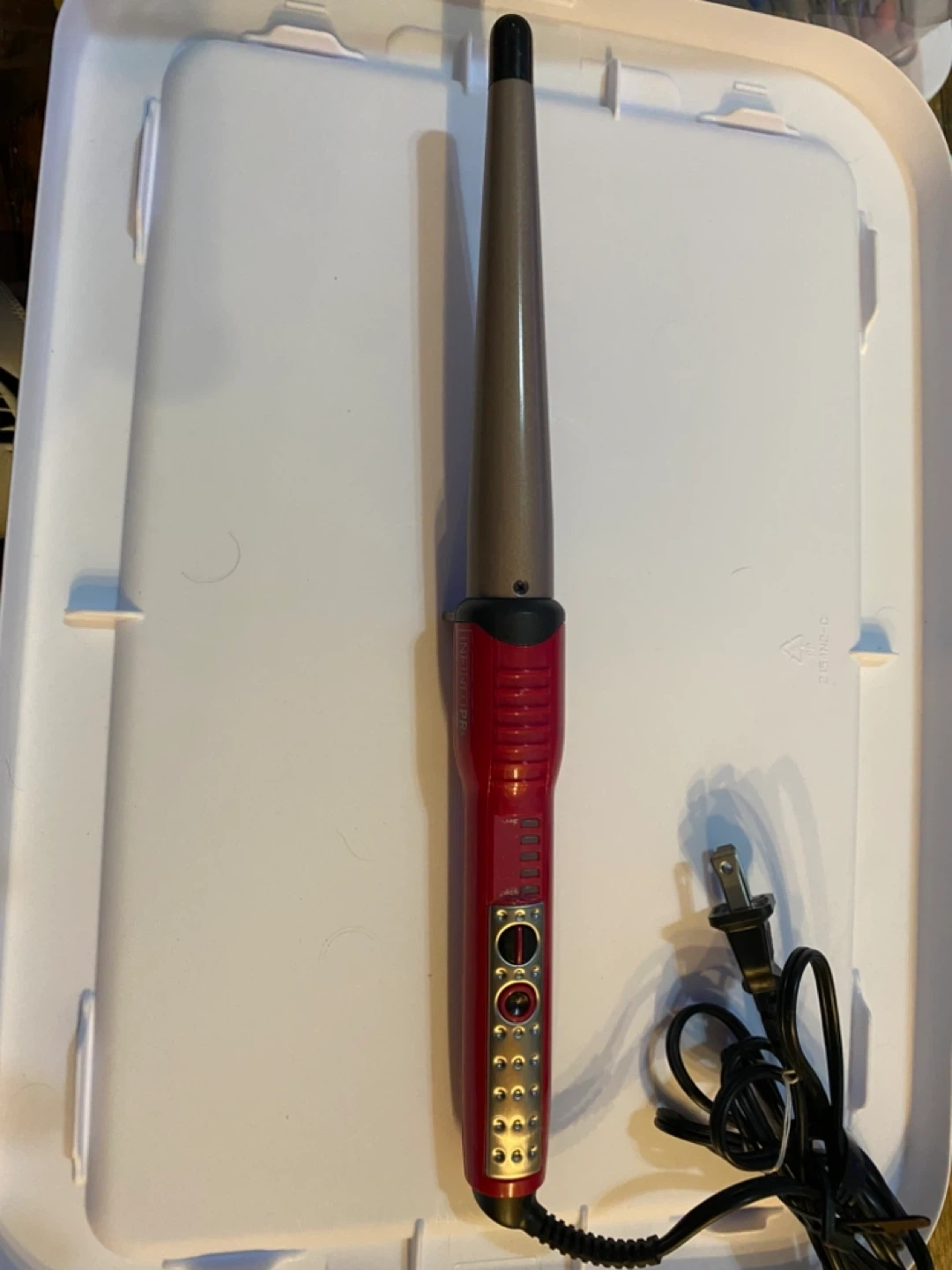 InfinitiPro by Conair tapered curling wand. It has a tapered barrel for creating curls and waves. The wand has adjustable heat settings for different hair types. Includes power cord. Pick up only.