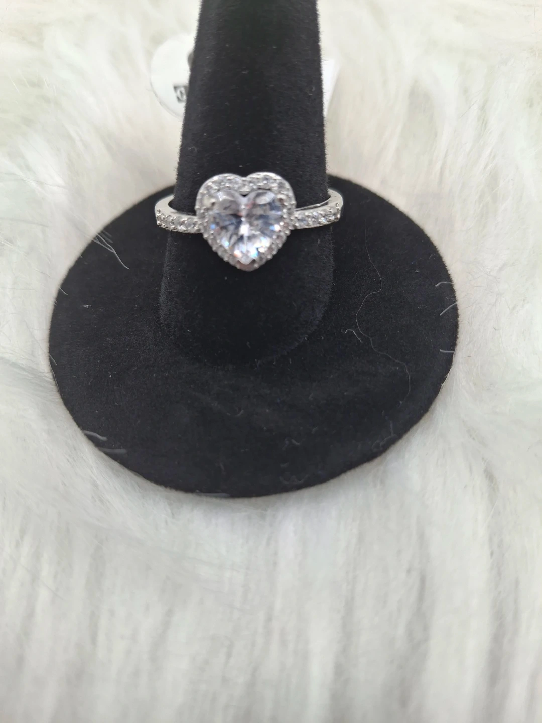 This ring features a heart-shaped center stone surrounded by a halo of smaller stones. The band is also adorned with pave-set stones. It's a sparkling addition for any occasion!