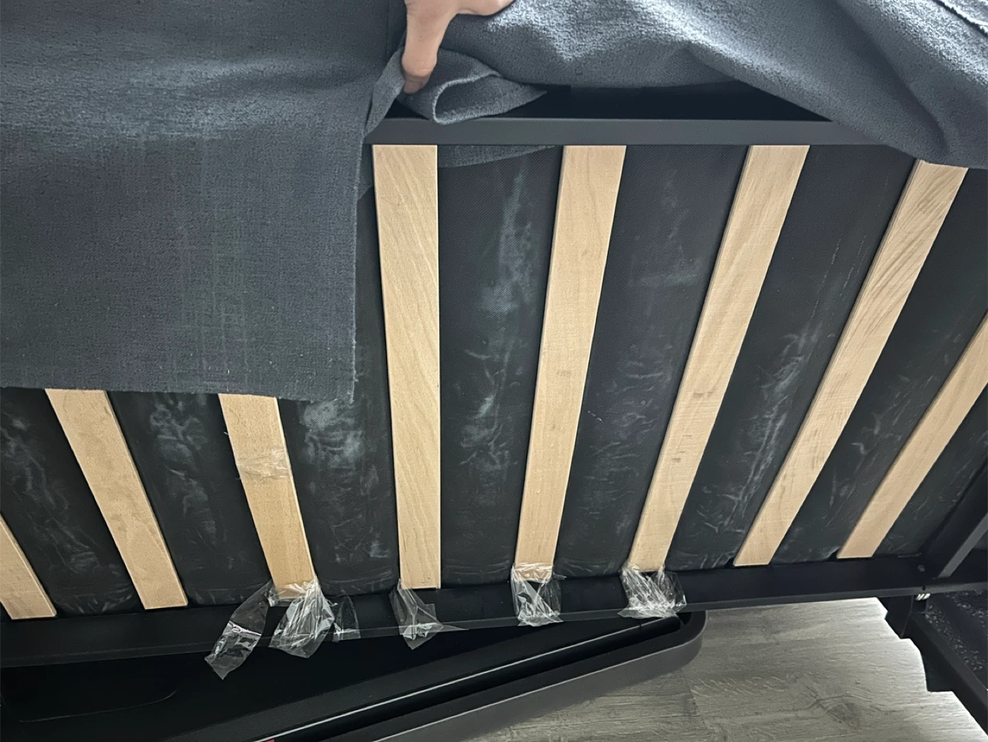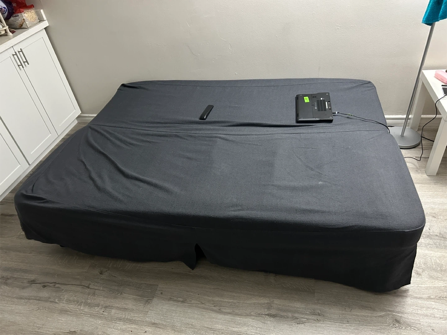 This is a dark grey sofa bed. It's got a wooden slat base for support. Could be useful for small apartments or guest rooms! Few slates are broken and taped. Can be replaced from Ikea spares. Grey cover is washable. Pet and smoke free home. Mattress has wine stains. Want to get rid off since the sitting position is not that great. Laptop is not included.