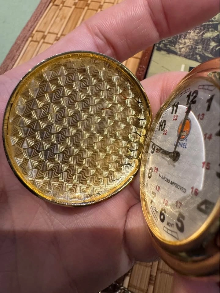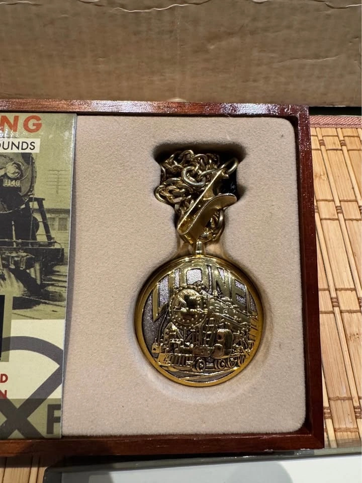 This gold-tone pocket watch features a railroad-themed design, working quartz movement, and lifelike train sound effects. A great display piece for train enthusiasts, Lionel collectors, or anyone who appreciates railroad nostalgia.