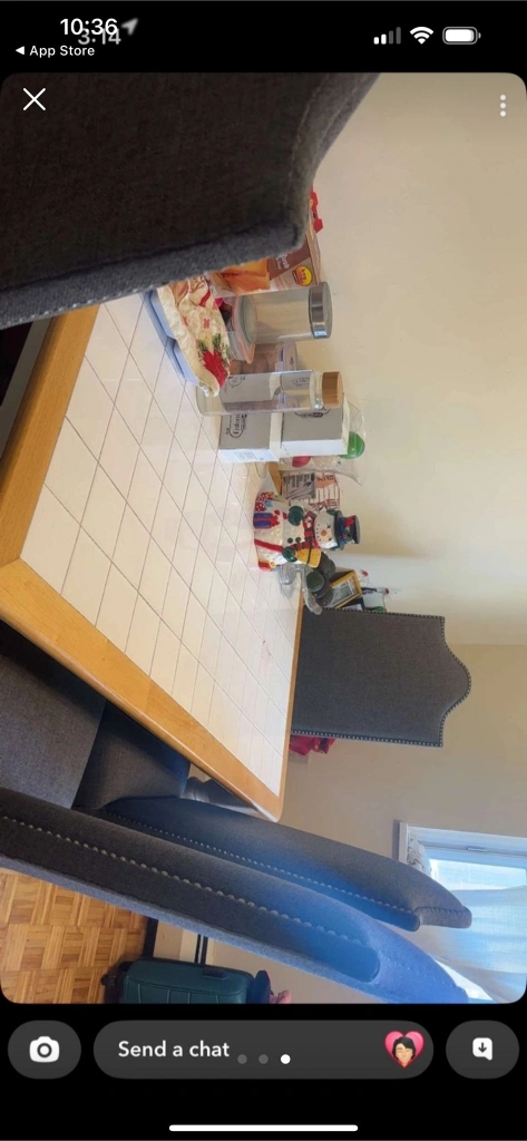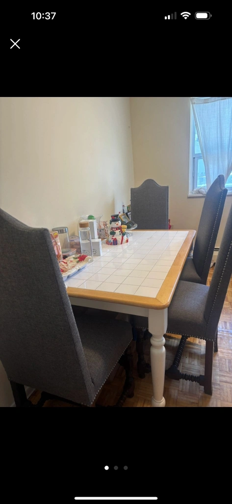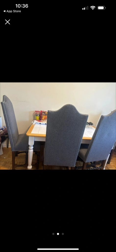 Selling a dining table with four stylish grey chairs. The chairs have a unique design and are in good condition. Perfect for a small dining area or kitchen!