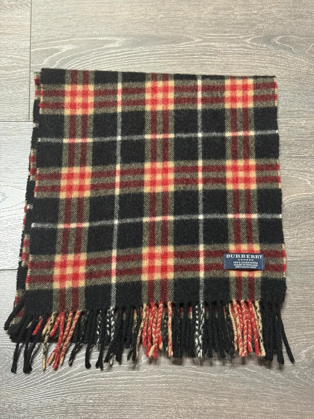 Authentic Burberry scarf is made of 100% cashmere and manufactured in England. It features the iconic Burberry plaid pattern in black, red, and beige. Dry clean only.