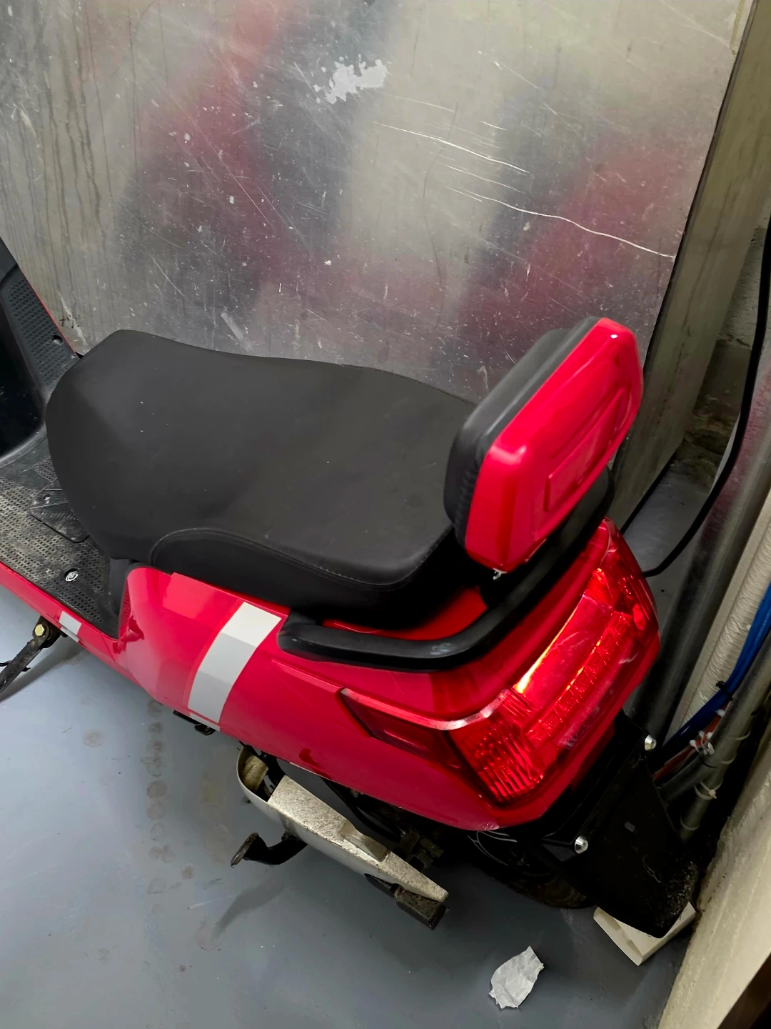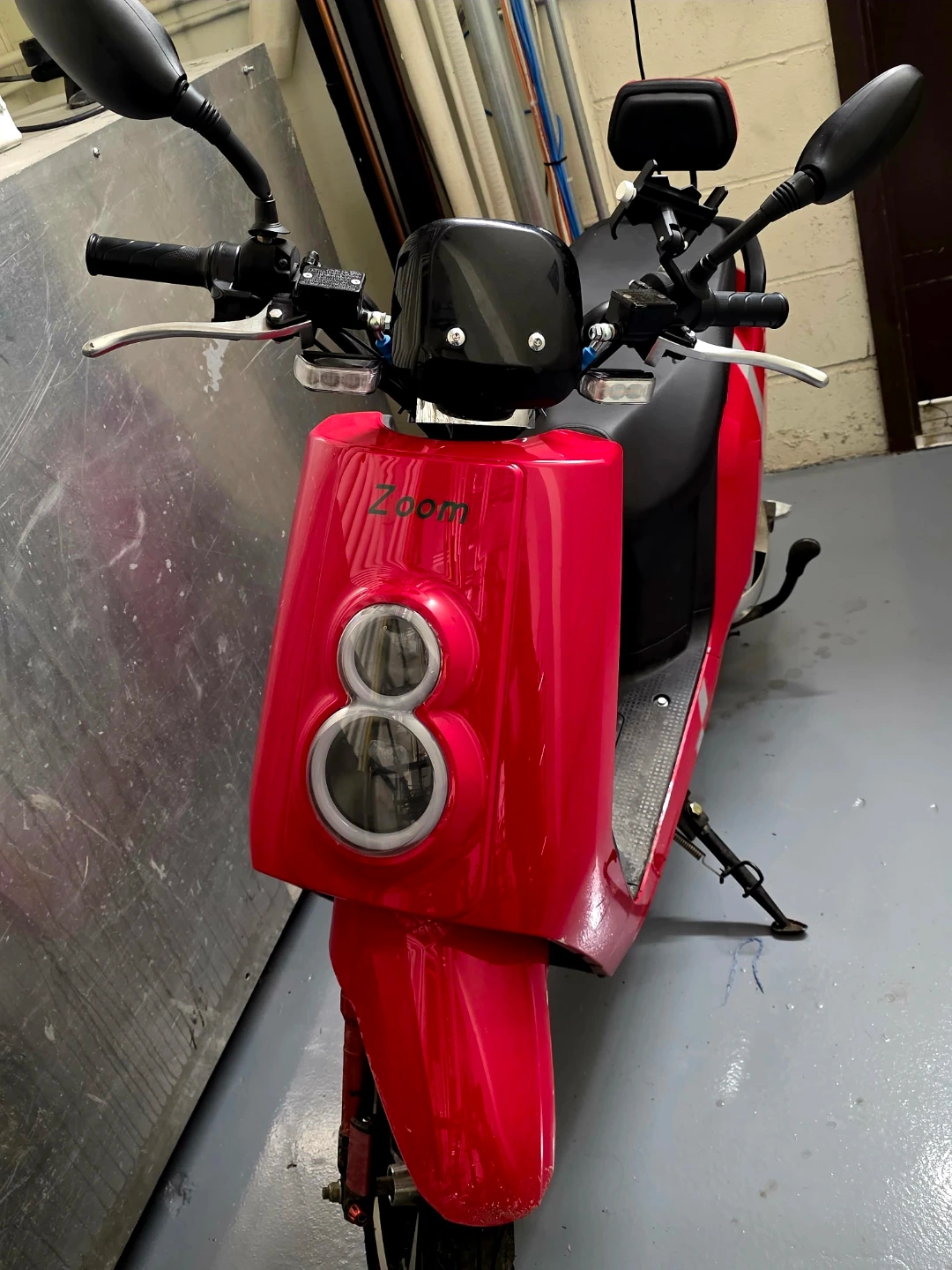 Red Zoom electric scooter with a black seat and accents, it was seldom ridden , i put a new battery system in it , It features dual headlights and a taillight. The scooter has a kickstand and mirrors. In beautiful condition , electric, up to 60 miles in one charge. Title is available.