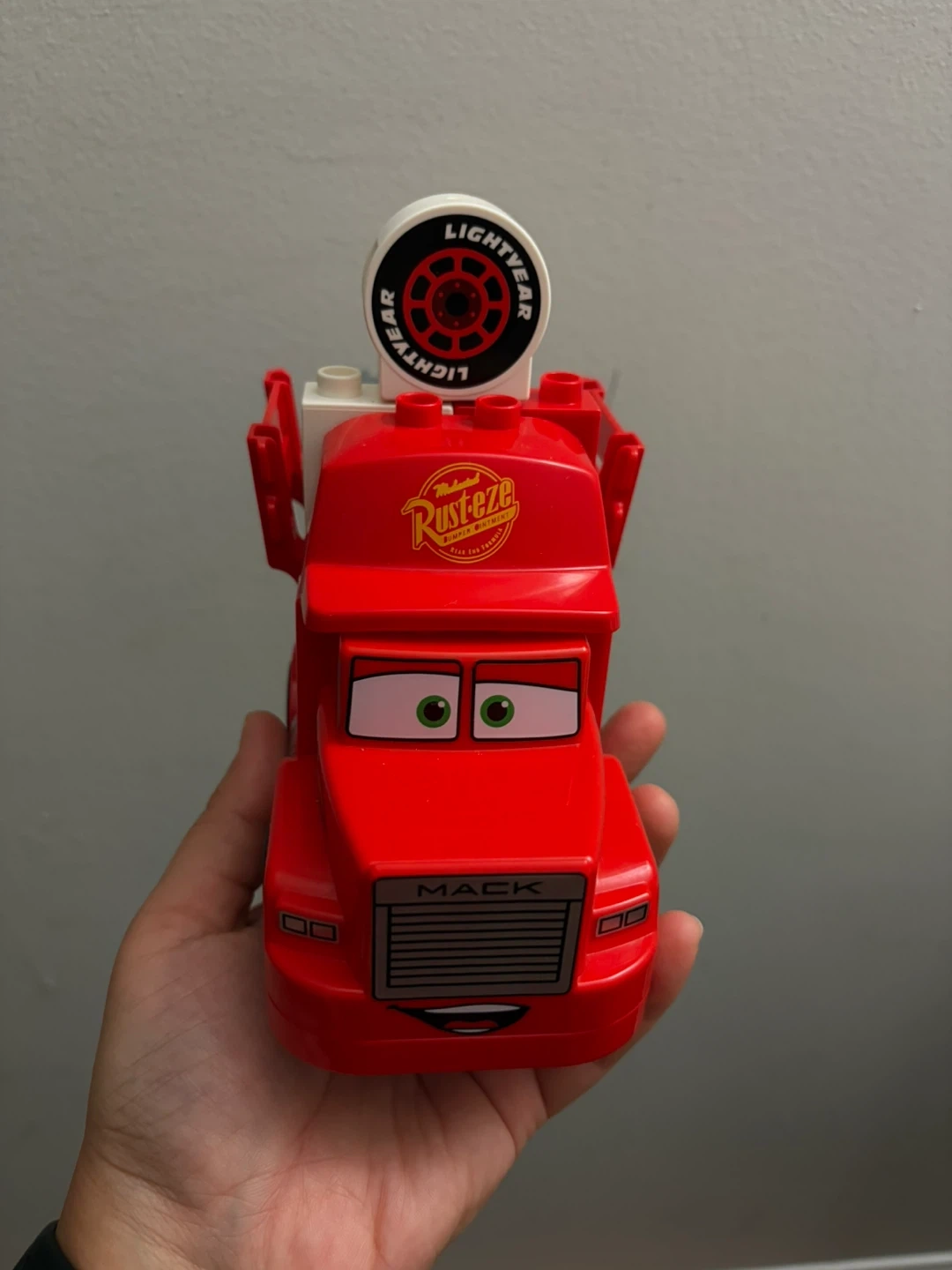 This is a red LEGO Duplo Mack truck, inspired by Disney's Cars. It has "Rust-eze" and "Mack" branding visible. Comes with attachable colourful building blocks for imaginative play!