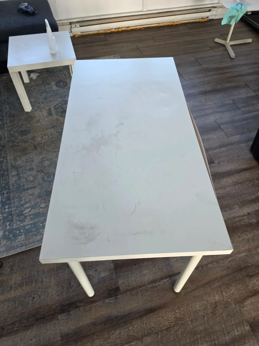 A white ikea table with white legs. It has some scuffs and a damaged edge on the side.