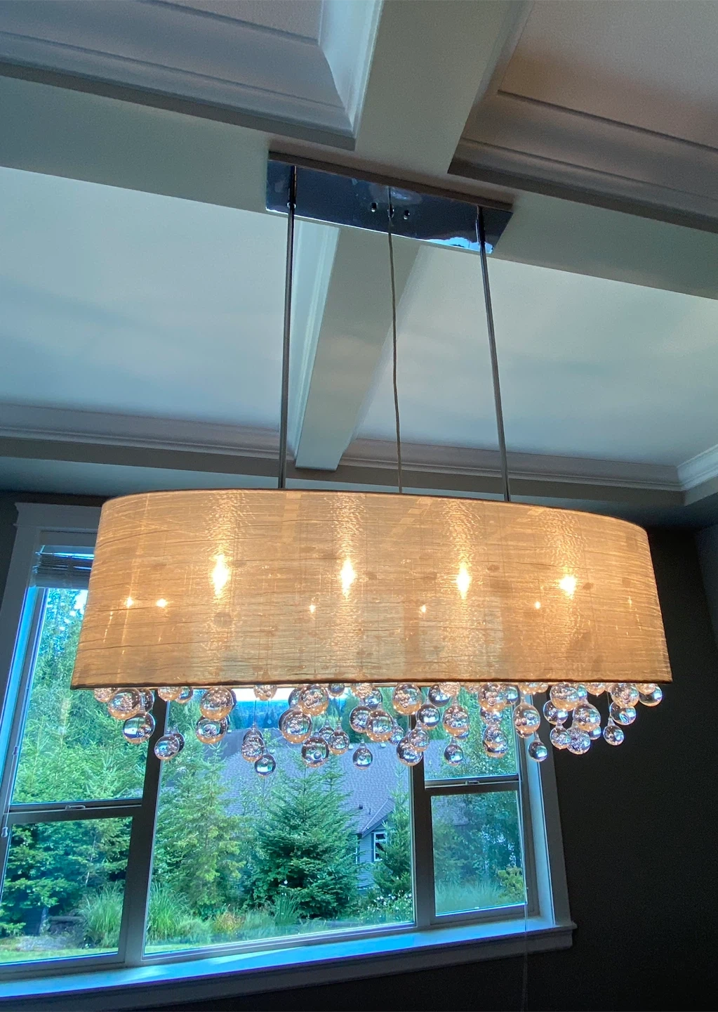 This stylish pendant light features a textured drum shade in a neutral tone. It's adorned with clear glass bubble-like accents for a touch of sparkle. It has four bulbs and would be great over a dining table or kitchen island.