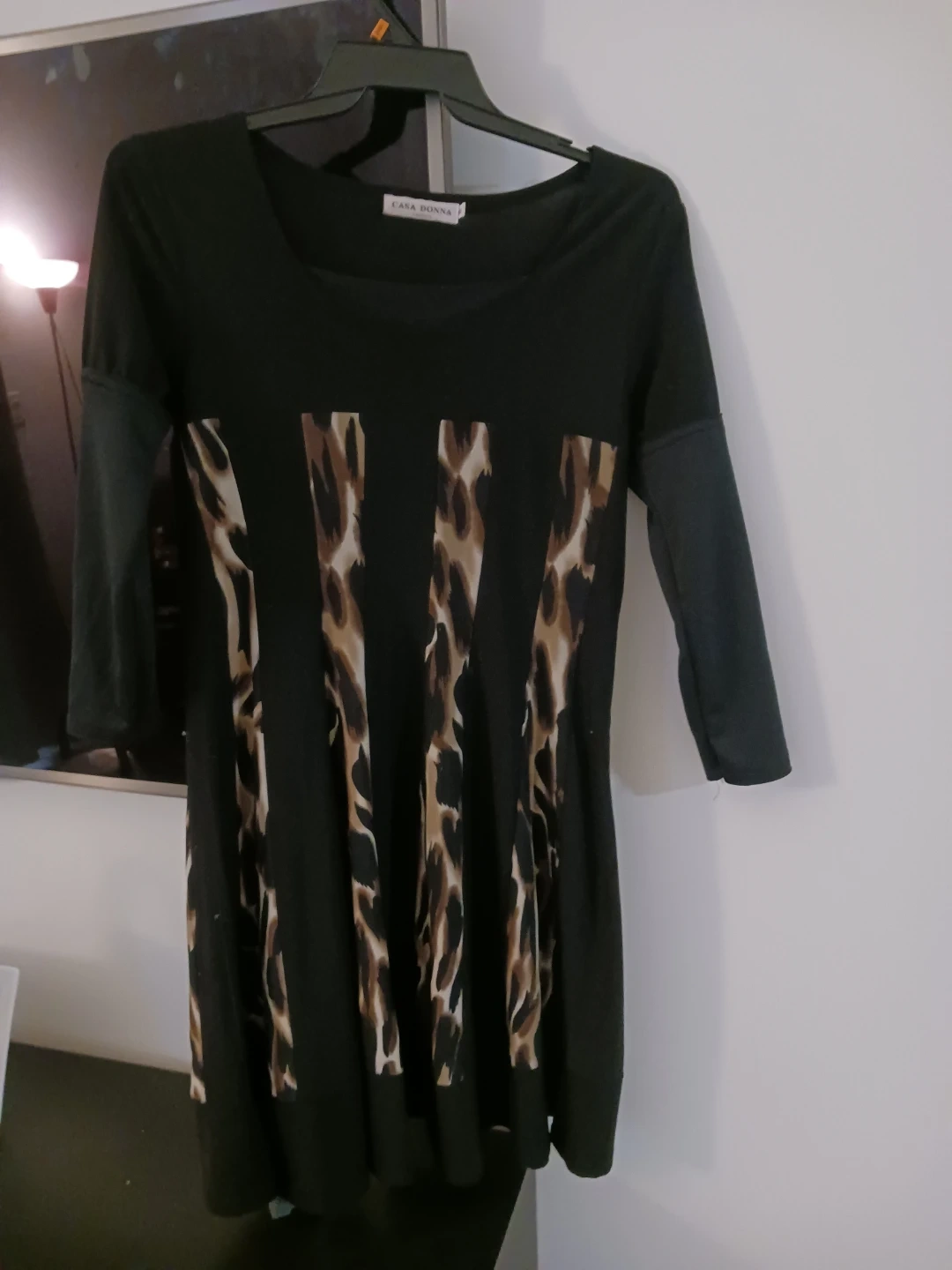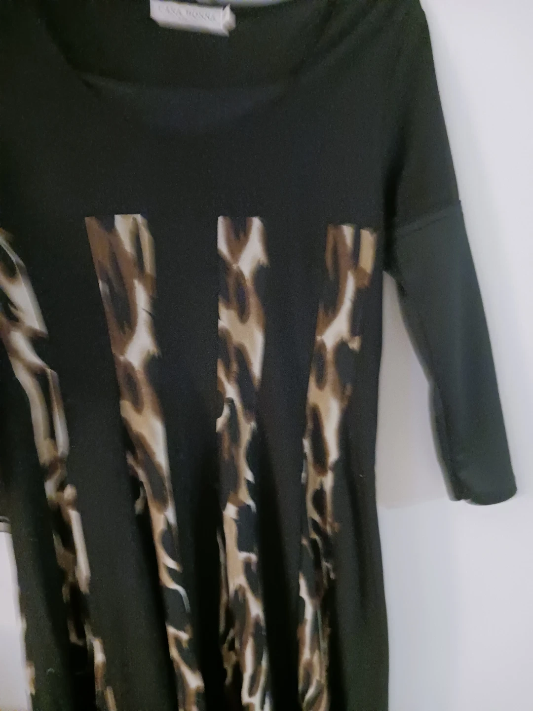 This black dress features vertical leopard print panels. It's a stylish piece for various occasions. Three-quarter sleeves.