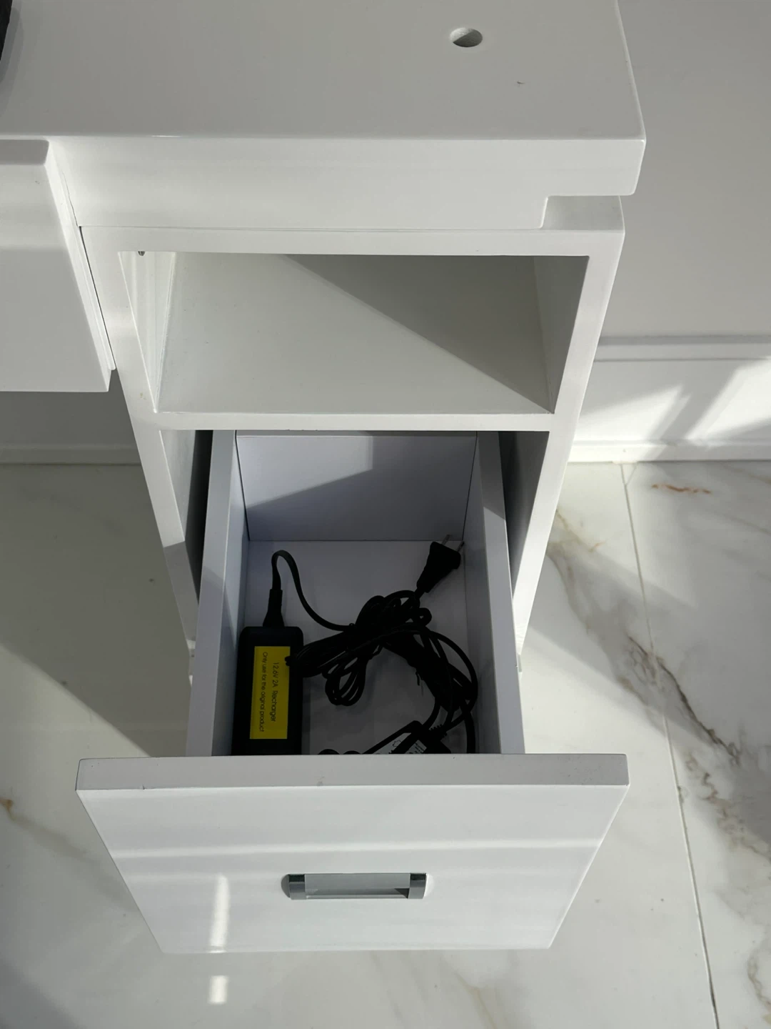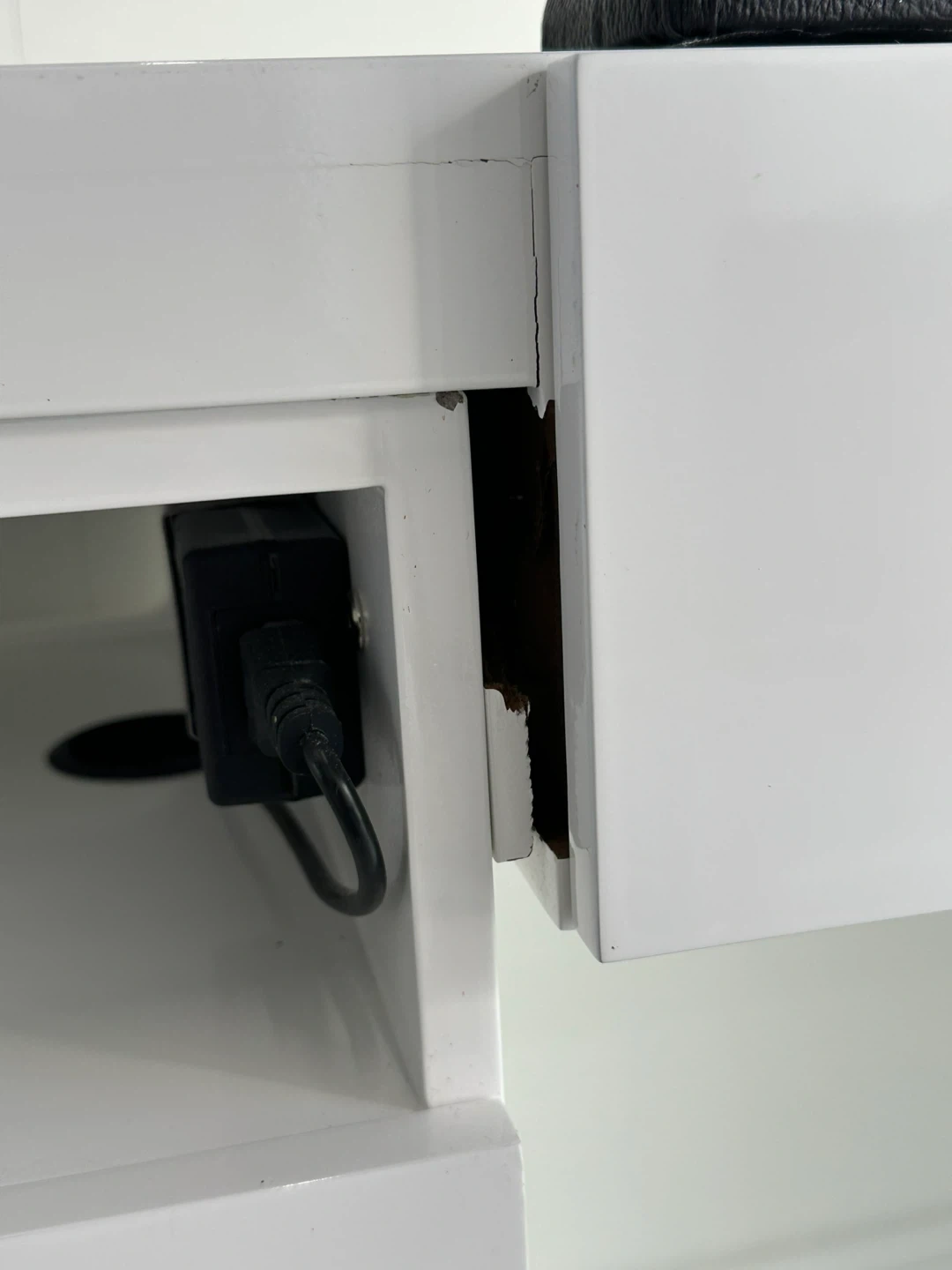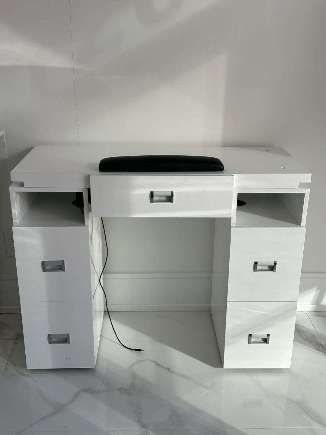 Selling a white manicure table/desk. It has some damage on the side as shown in the pictures, but otherwise it's in good condition. Perfect for a salon or home setup!