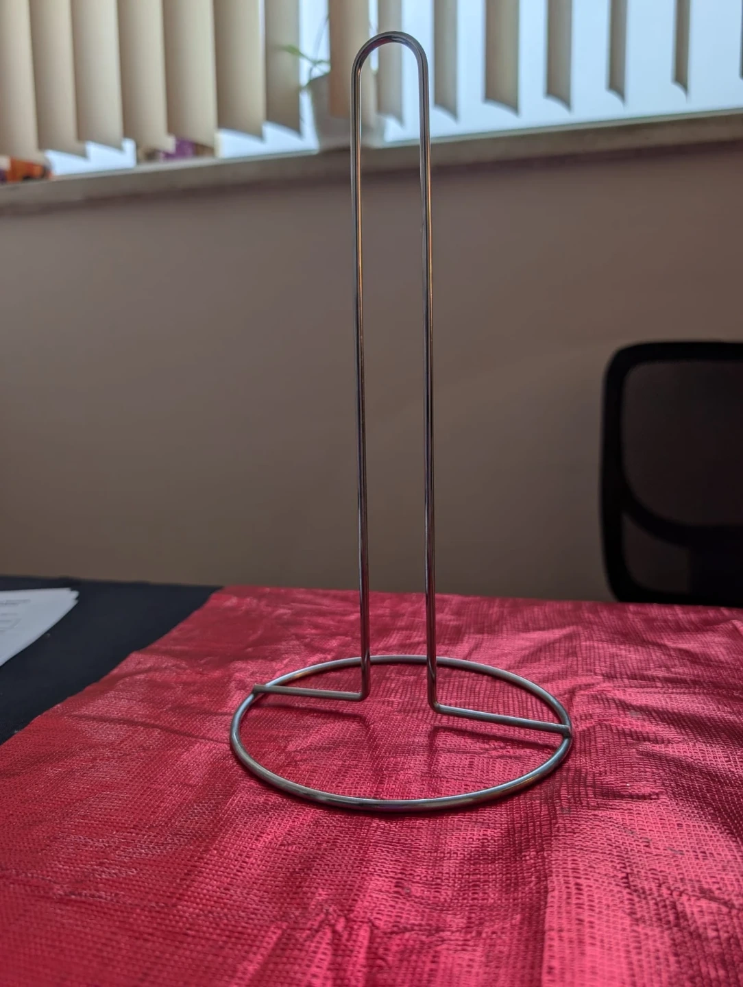 A simple metal paper towel holder. It's made of metal and has a circular base. This holder is handy for keeping paper towels accessible on your counter.