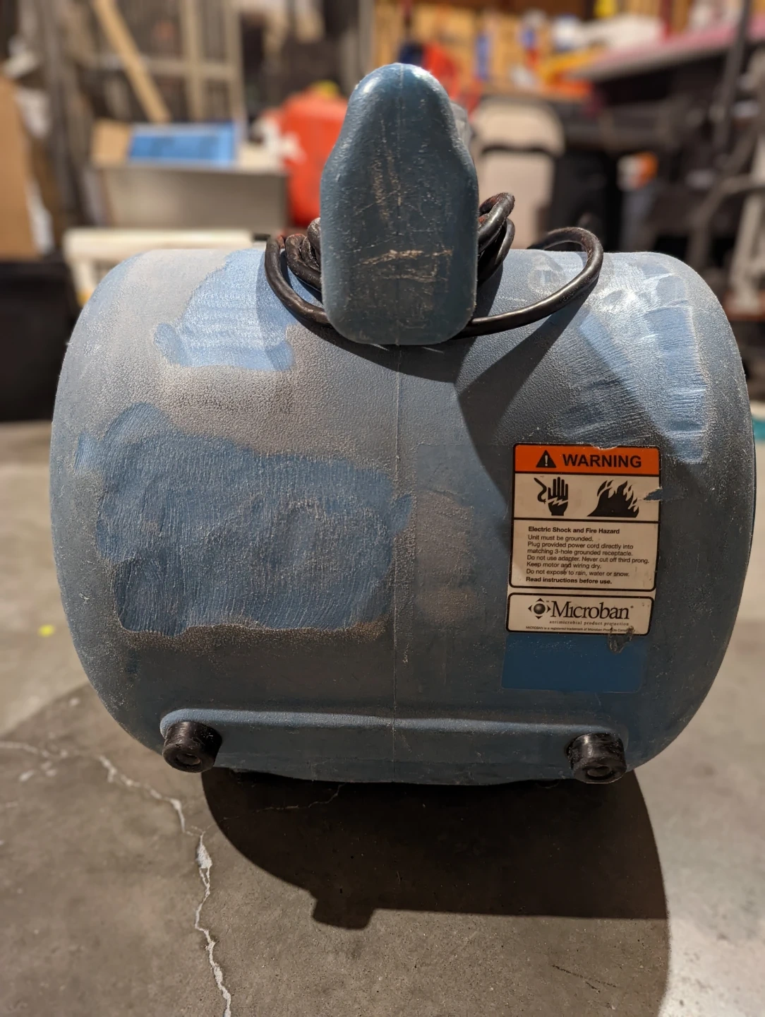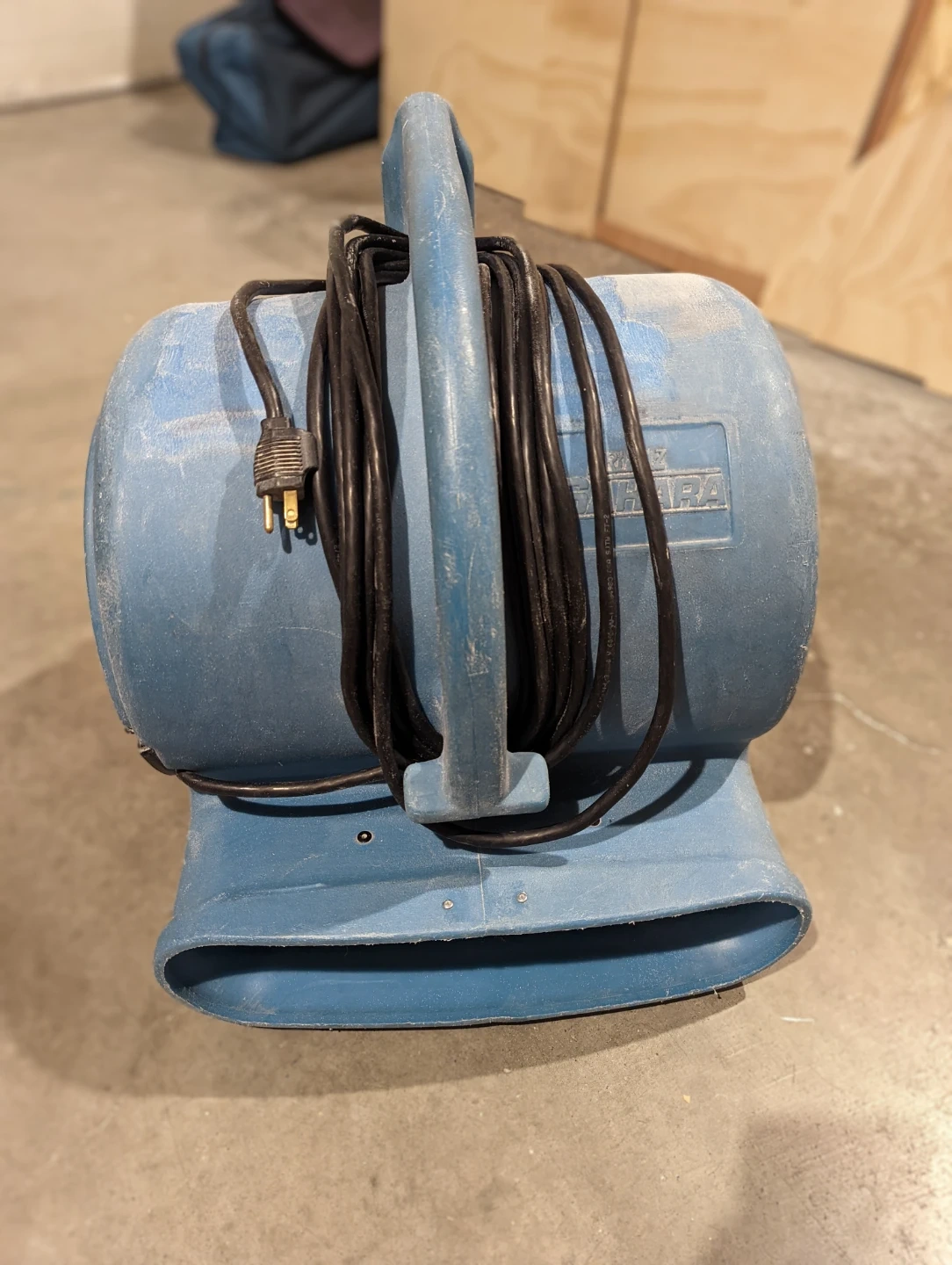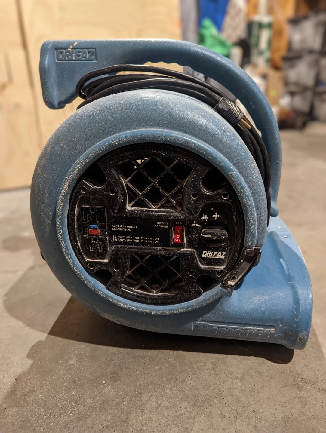 This is a Dri-Eaz TurboDryer B42 commercial air mover. It features a heavy-duty plastic housing and a built-in cord wrap. This unit is great for drying carpets or circulating air.
