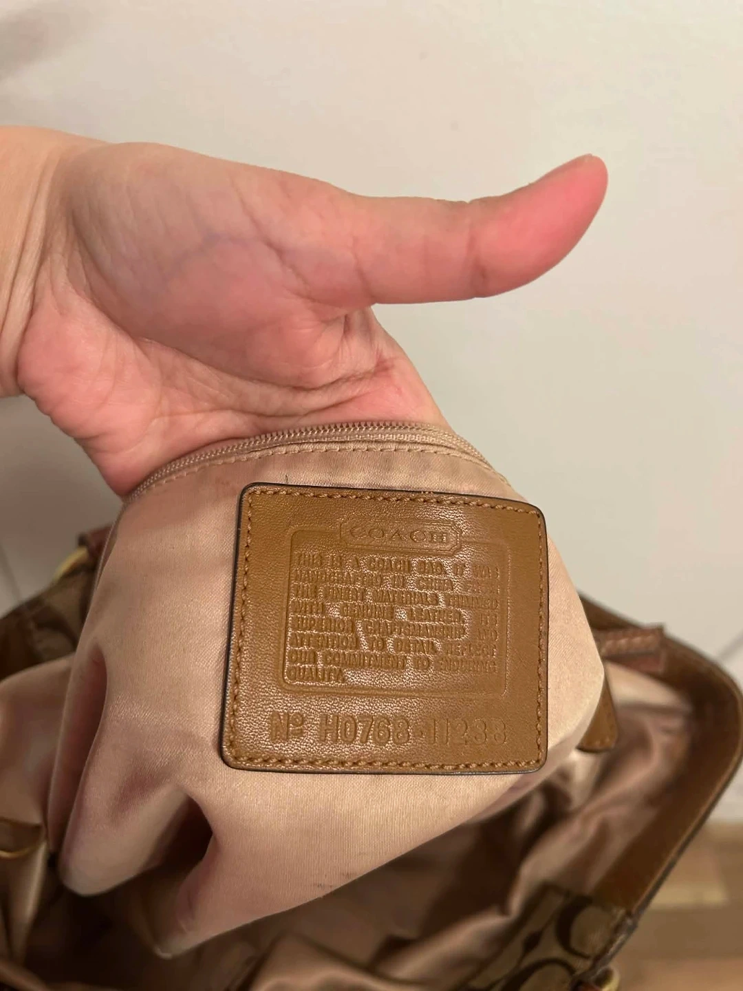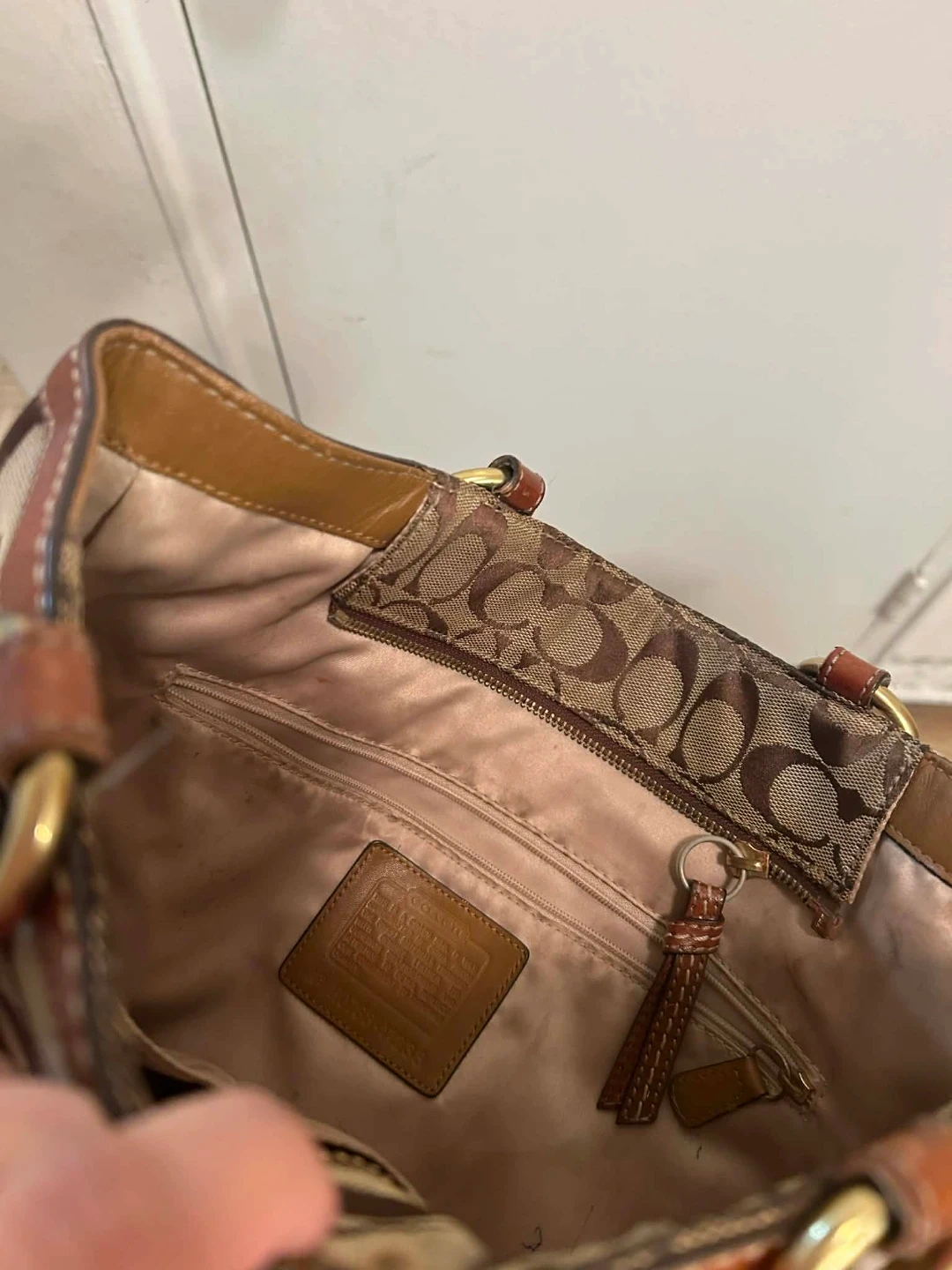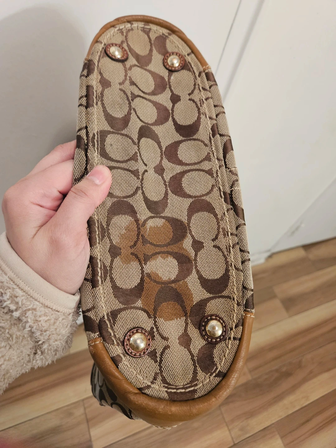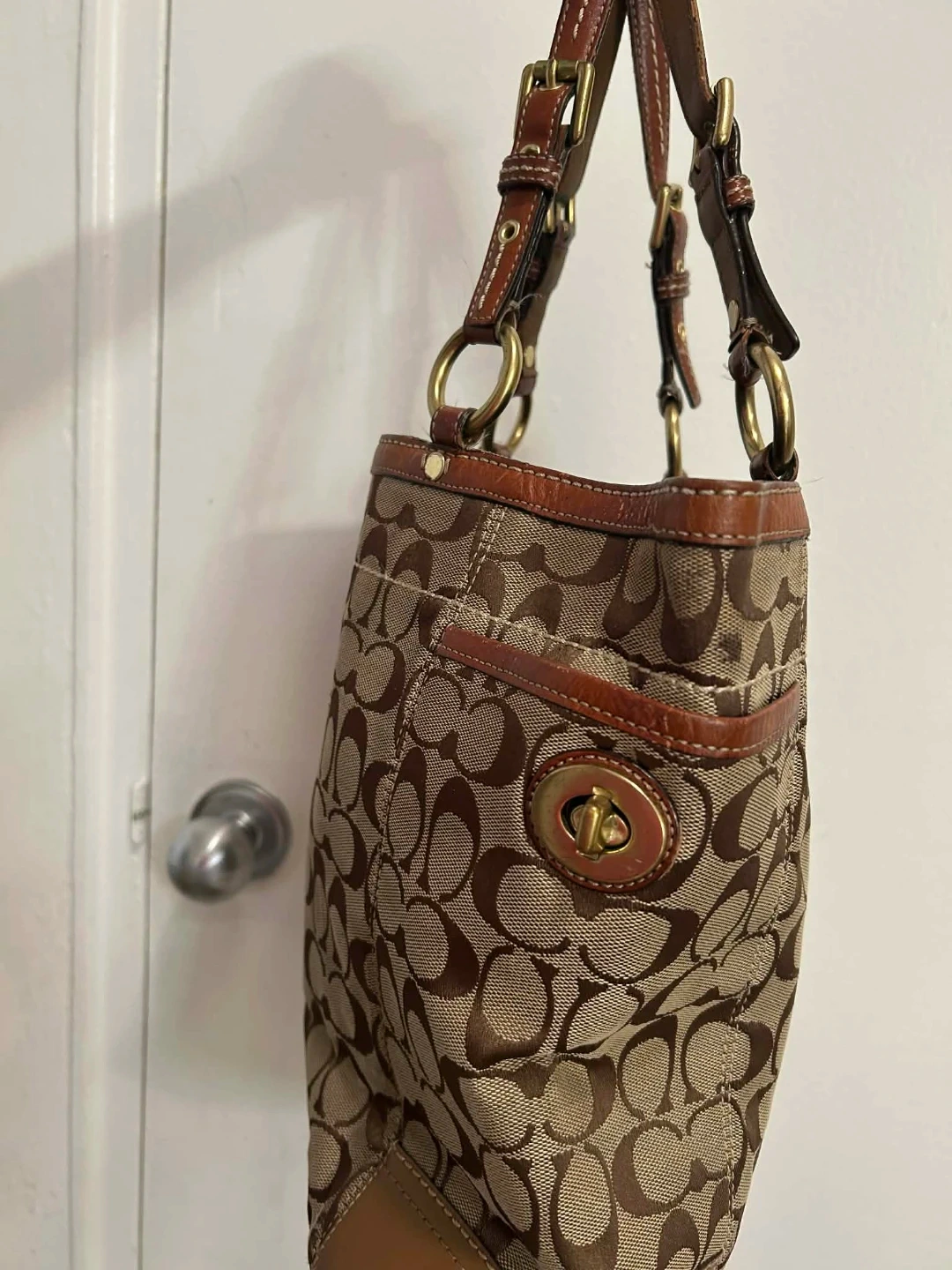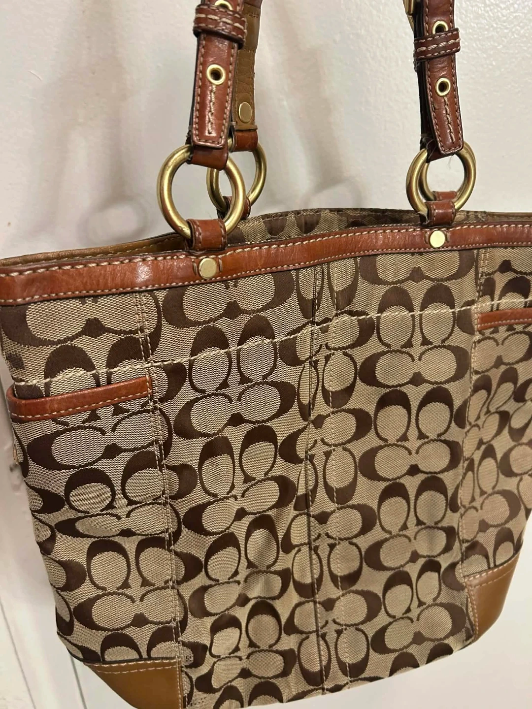 A stylish Coach tote bag in their signature monogram print. It's made with a combination of canvas and leather trim. Features multiple exterior pockets for easy access. This bag is perfect for everyday use! There is a stain in bottom part and Just needs cleaning .