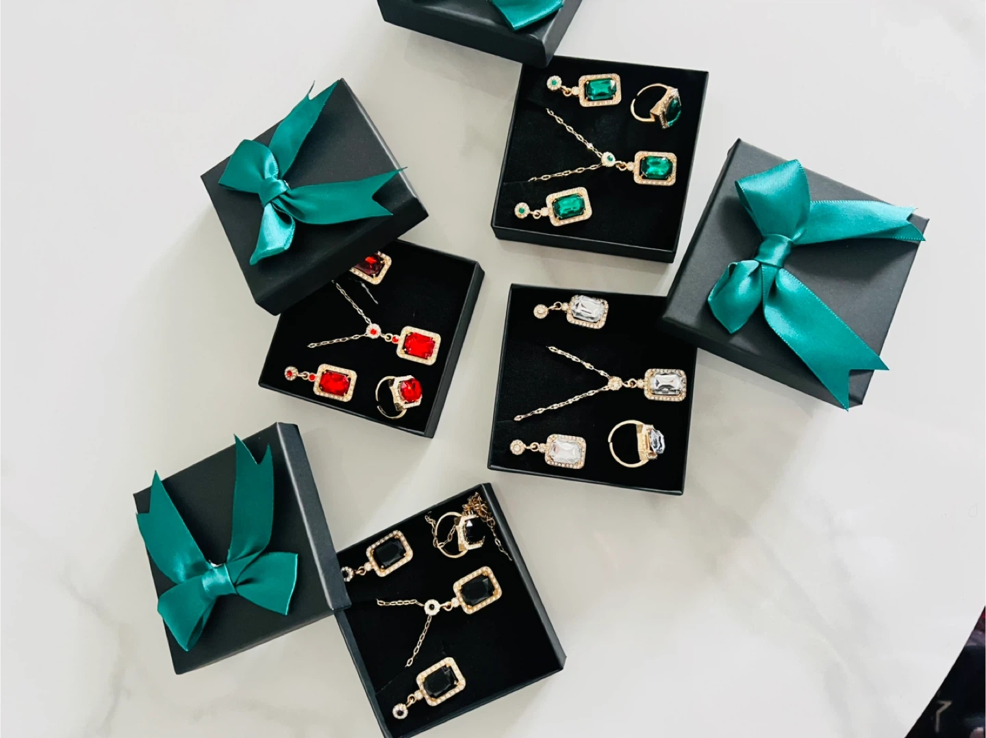 These jewelry sets include necklaces, earrings, and rings. Available in red, green, and clear stones. Great for adding a touch of sparkle to any outfit!