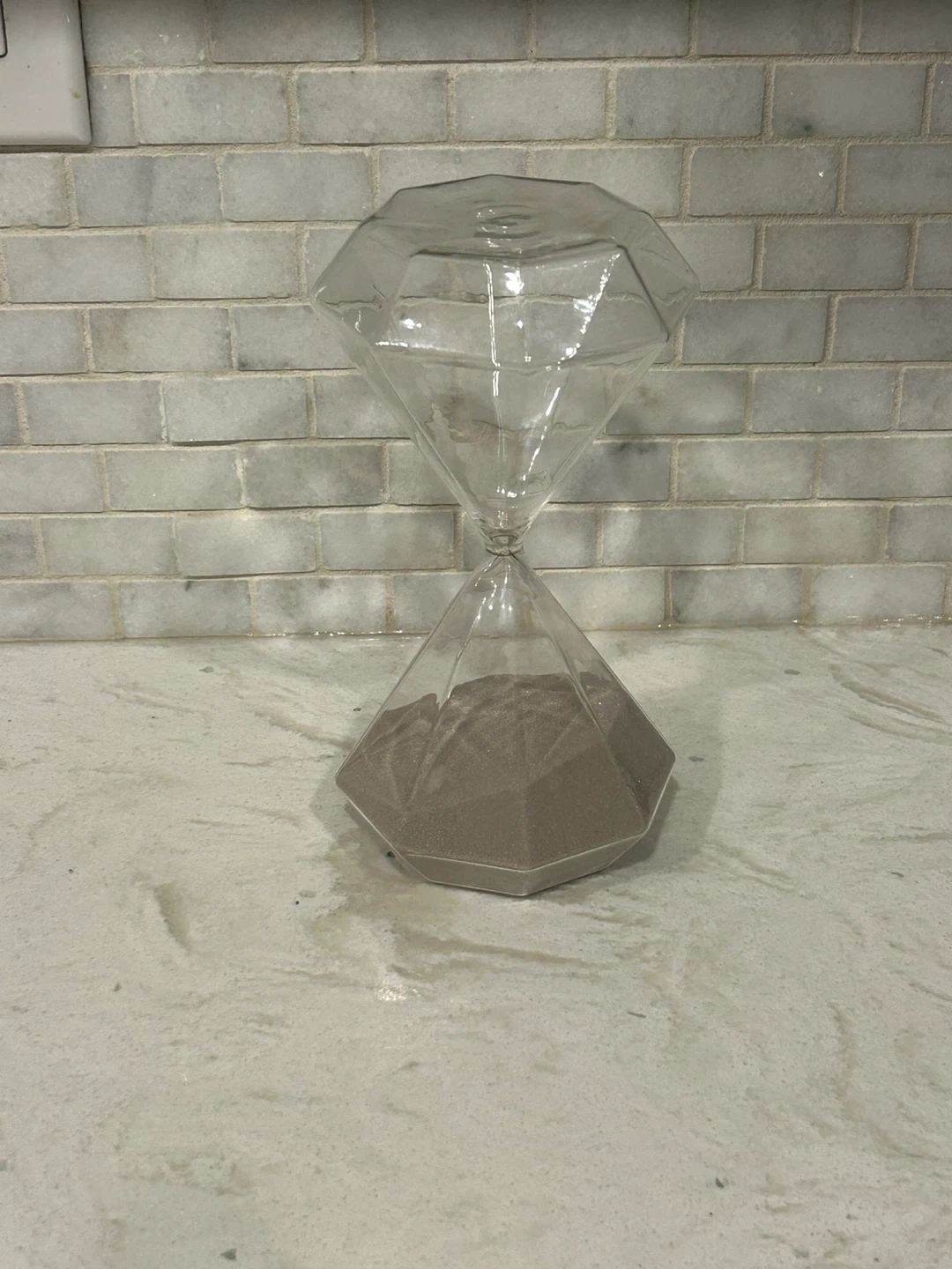 This hourglass sand timer is shaped like a diamond. Its unique design makes it a neat decorative piece. It's useful for timing short activities or as a conversation starter!