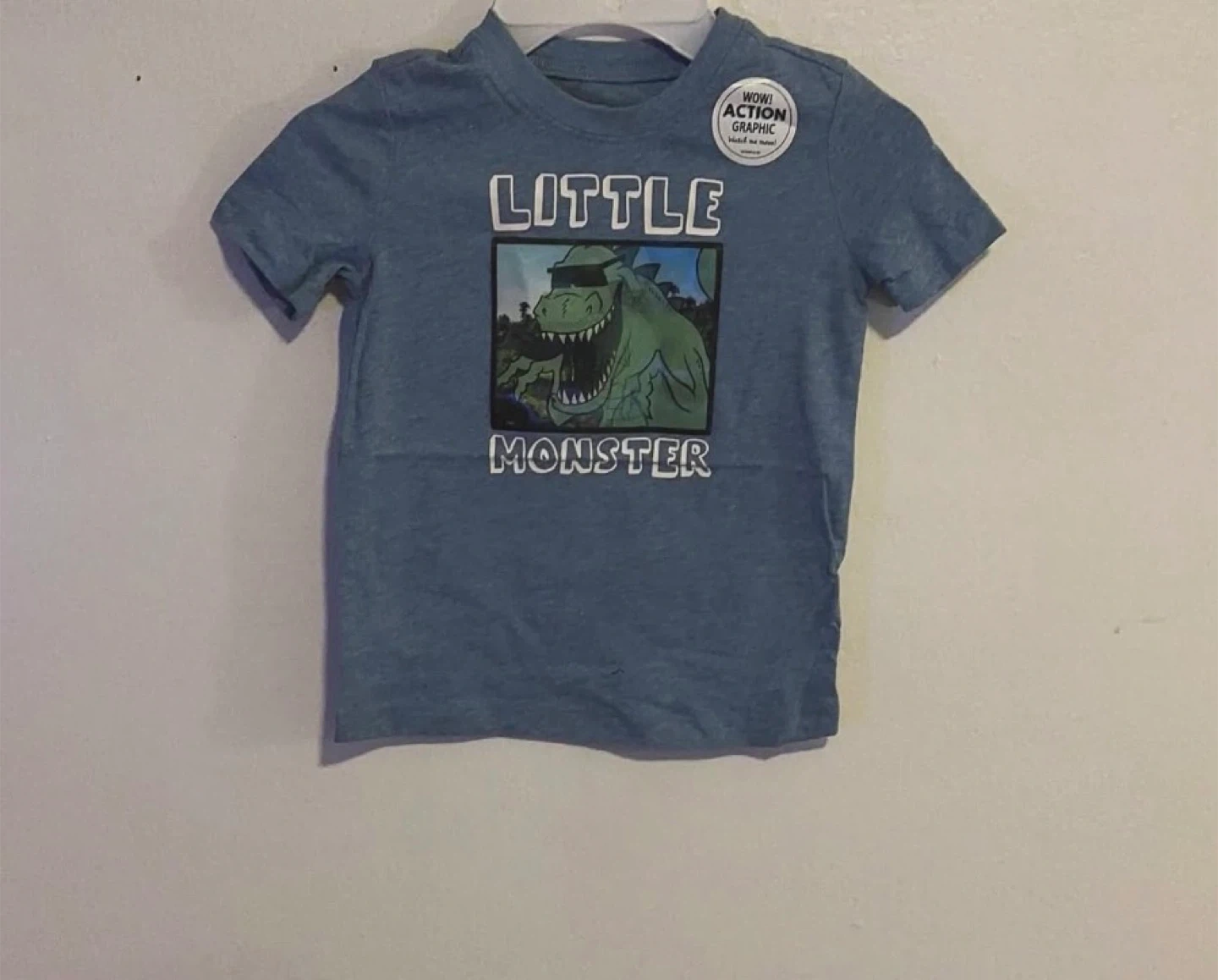 This blue t-shirt for boys features a fun "Little Monster" graphic with a dinosaur wearing sunglasses. It has a short-sleeve design and a crew neck. The fabric appears to be a soft cotton blend.