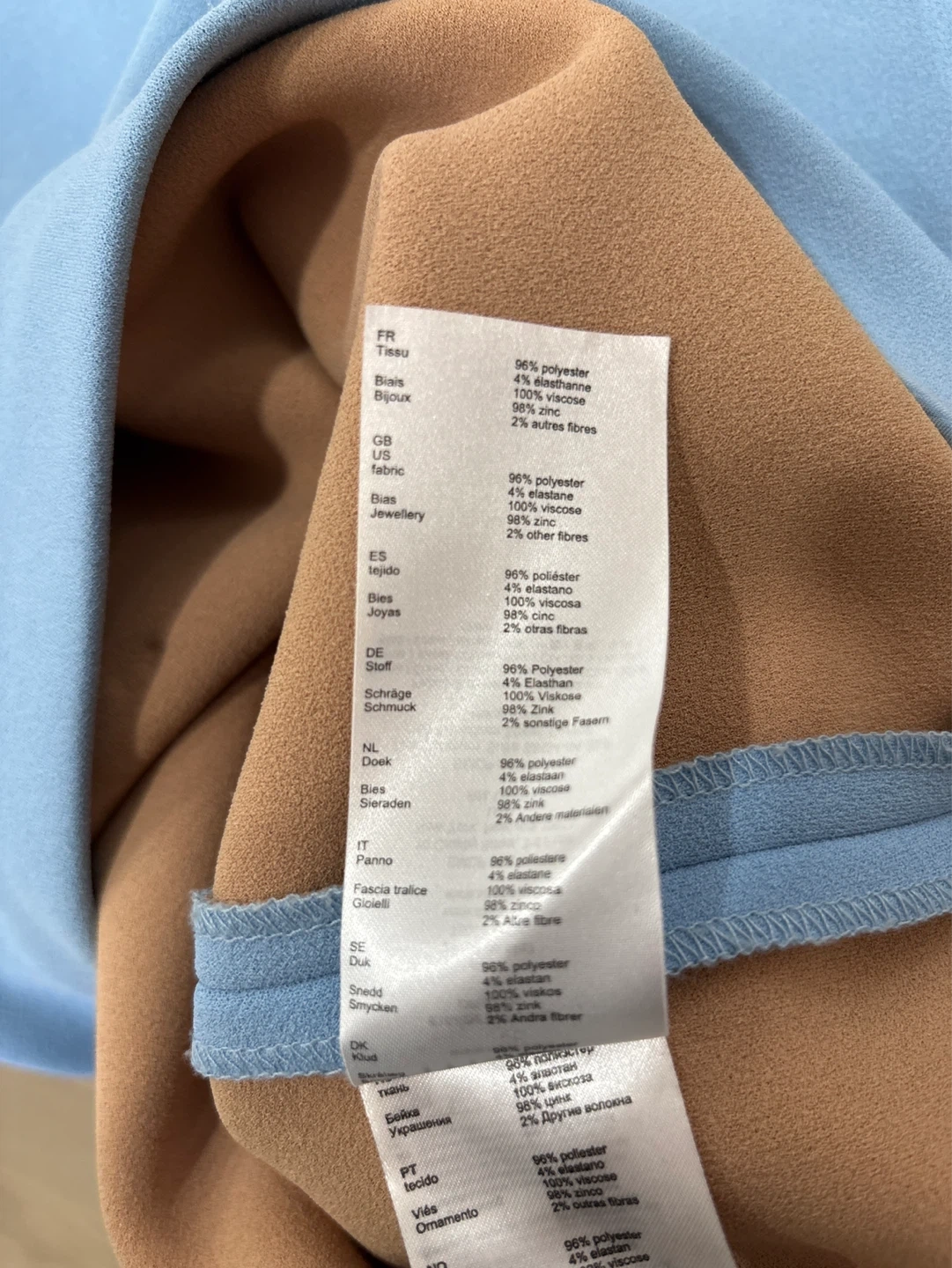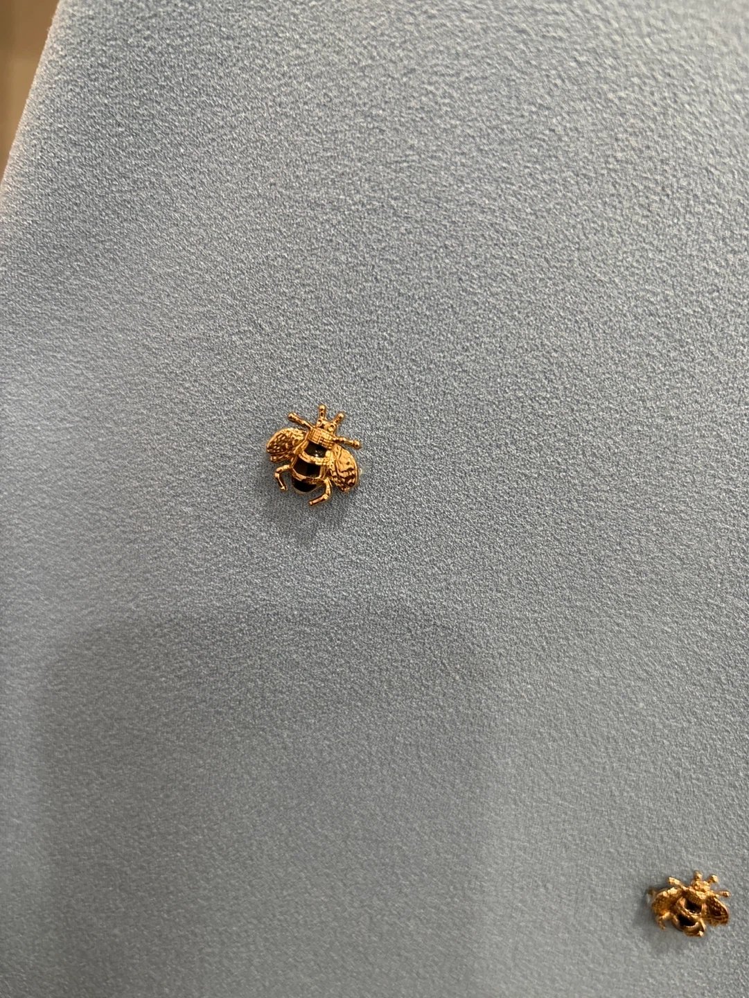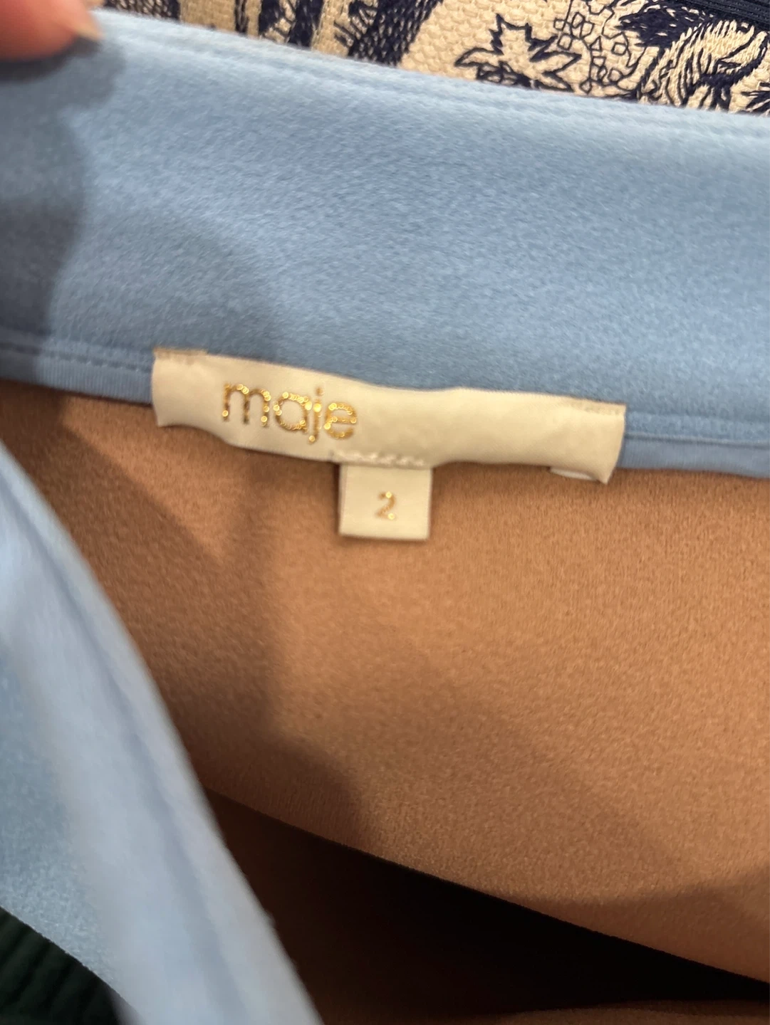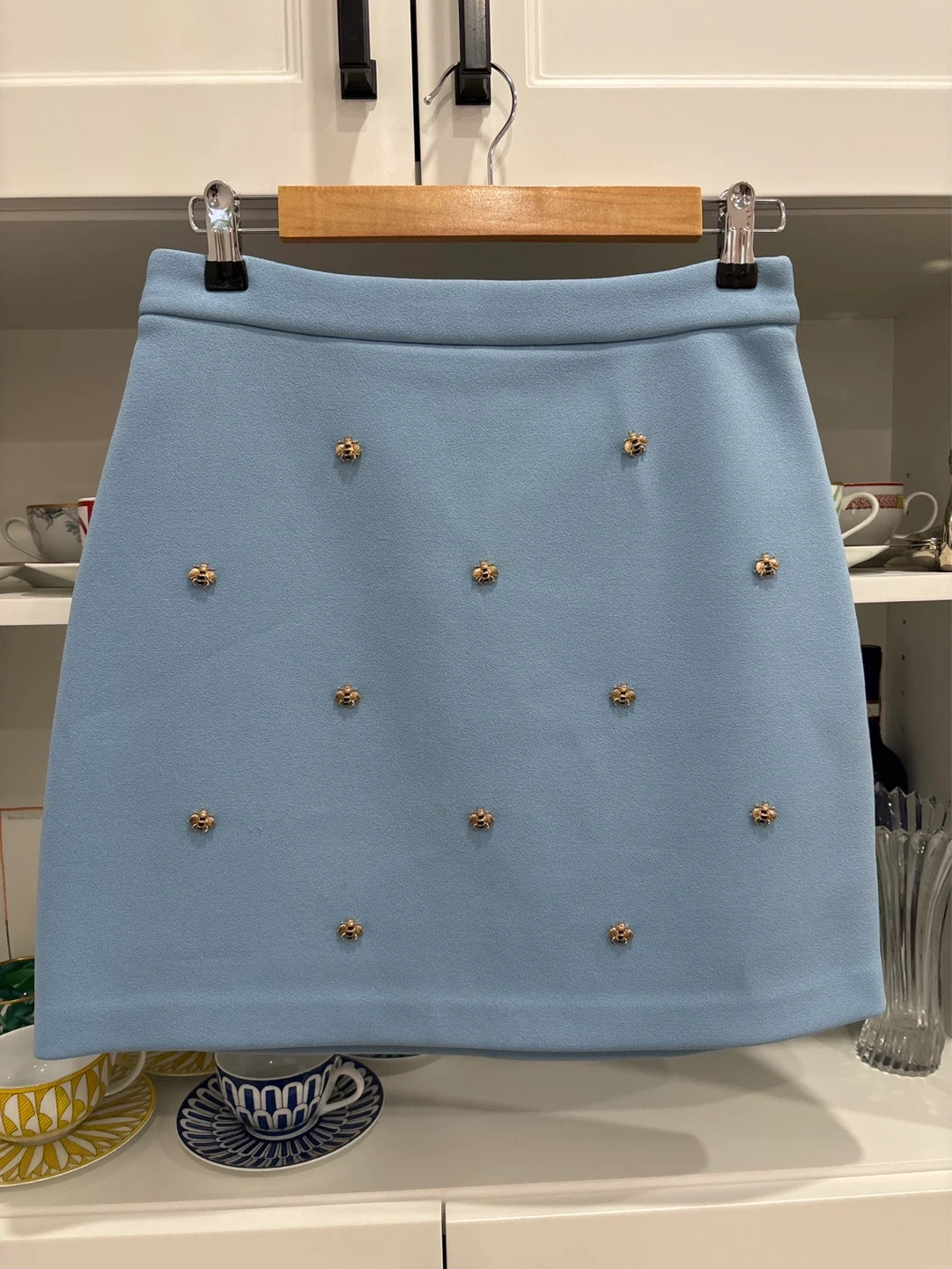 This Maje skirt is a lovely light blue colour with embroidered gold bees all over. It's a size 2. The fabric composition is 96% polyester, 4% elastane, and 2% other fibres.