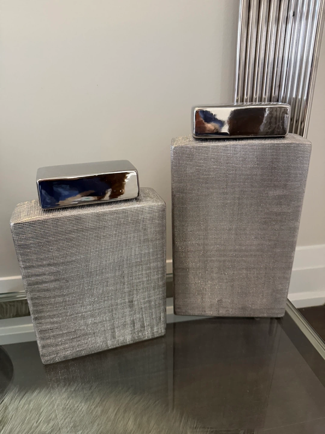 Set of two decorative pedestals with silver textured finish and shiny chrome-look tops. These pedestals add a touch of modern elegance to any space. They're perfect for displaying sculptures or plants.