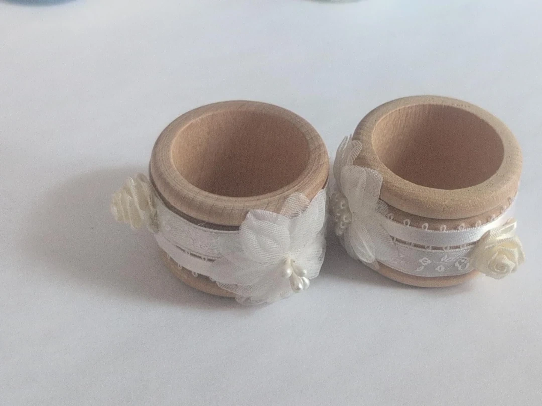 Two wooden napkin rings, each adorned with white lace ribbon, fabric flowers, and pearls. These charming rings add a decorative touch to table settings. They're perfect for special occasions or everyday elegance.