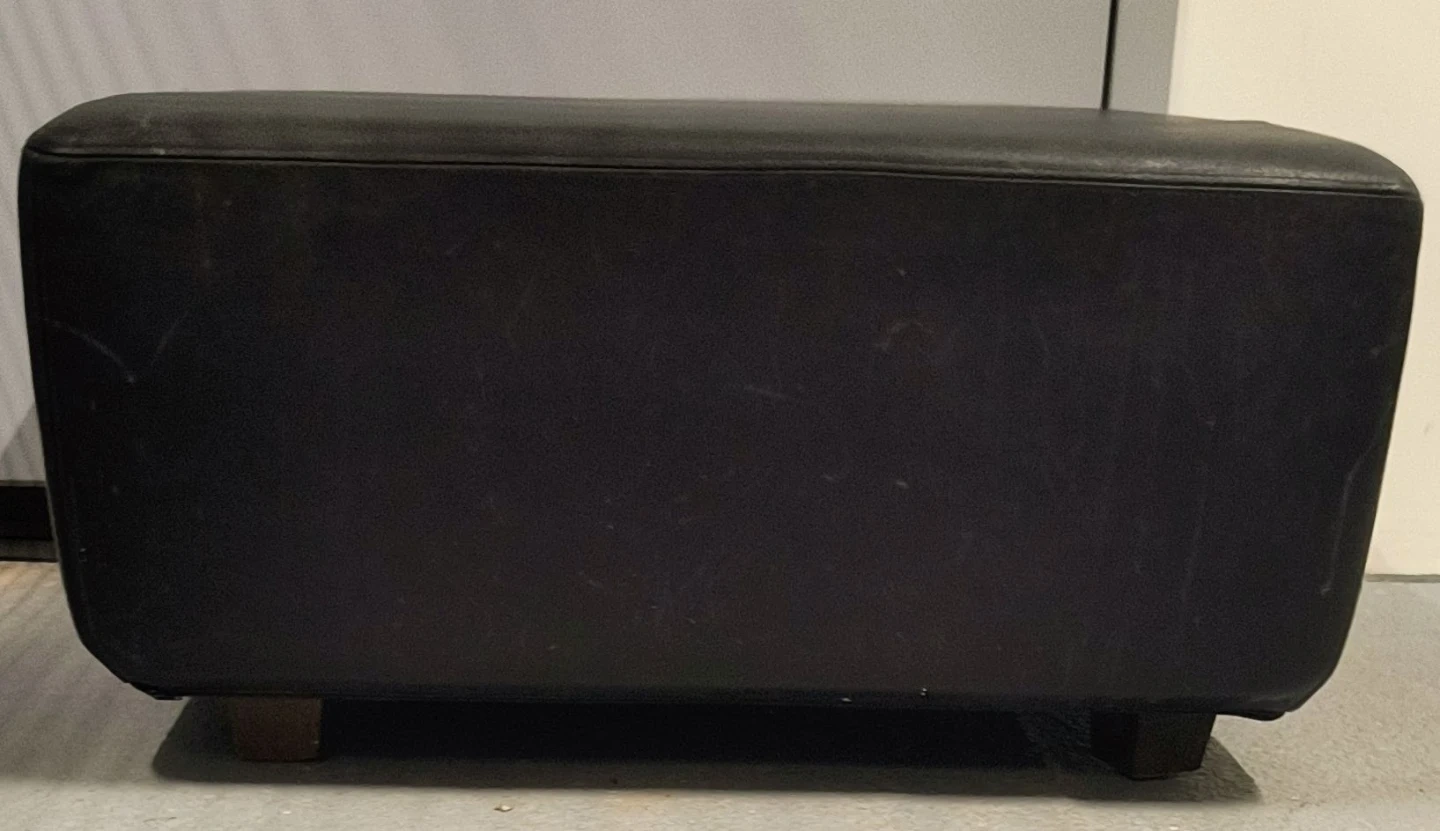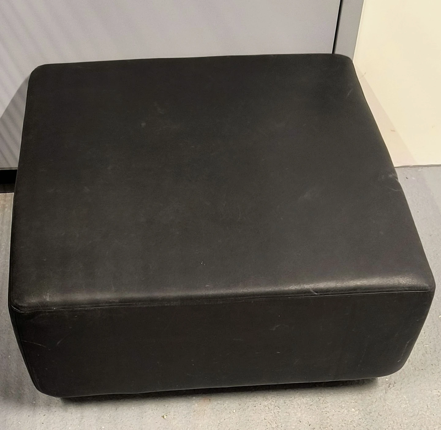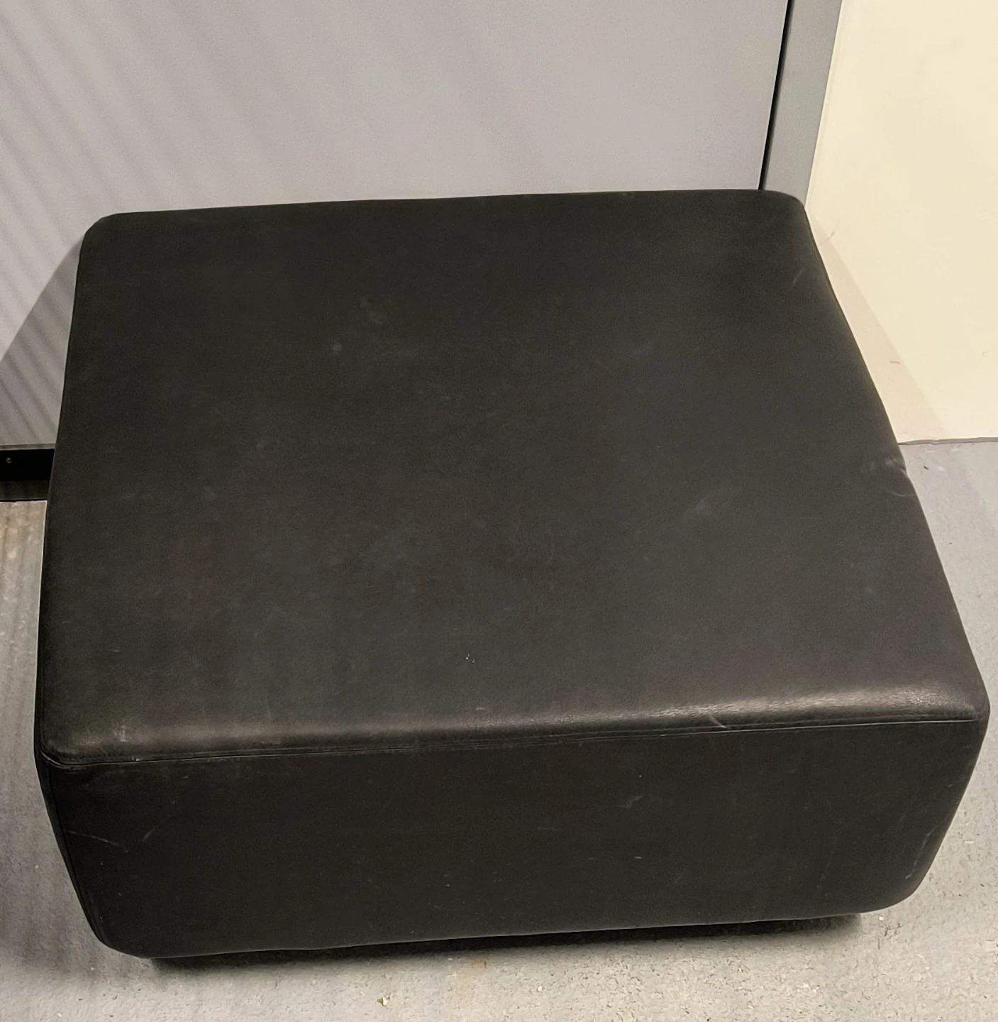 A versatile black leather ottoman. It's upholstered in what appears to be leather. This ottoman can serve as a footrest or extra seating. Its simple design fits many decors.