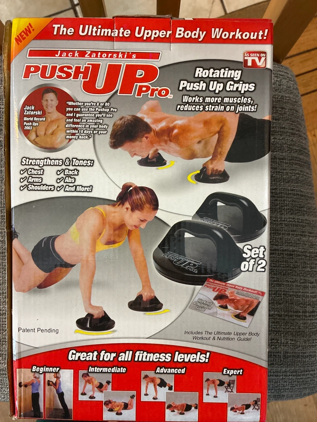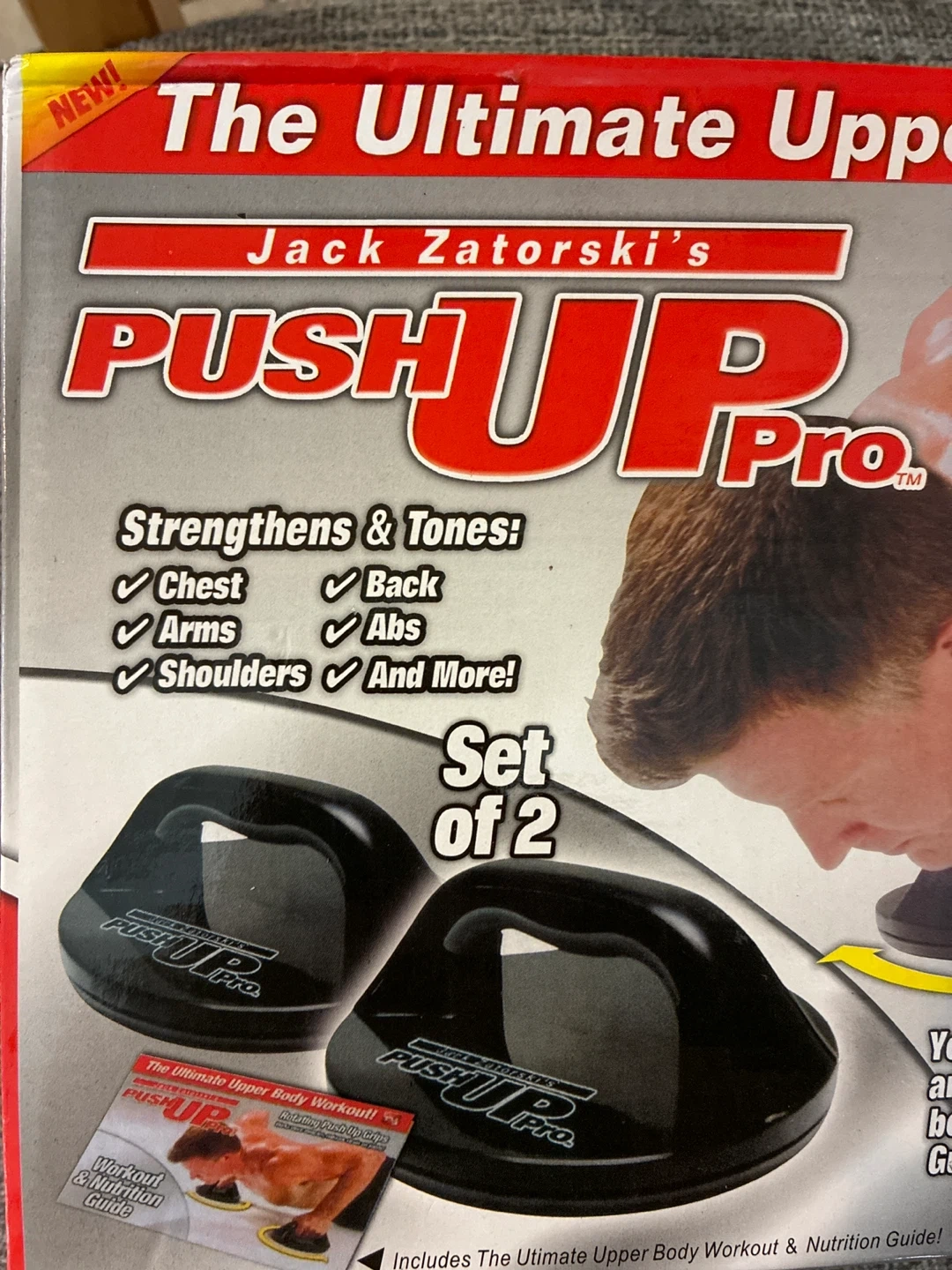 Get fit with these Push Up Pro rotating push up grips! This set of 2 helps strengthen and tone your chest, back, arms, and shoulders. They work more muscles and reduce strain on your joints. Includes The Ultimate Upper Body Workout & Nutrition Guide!