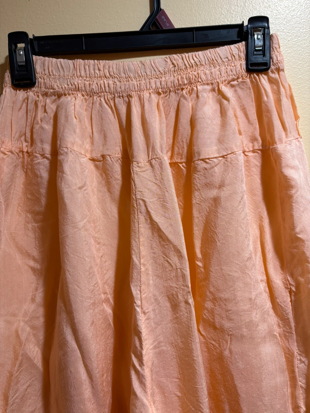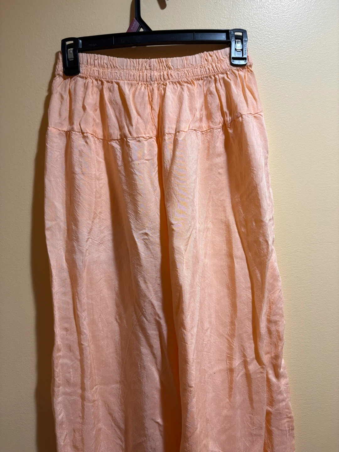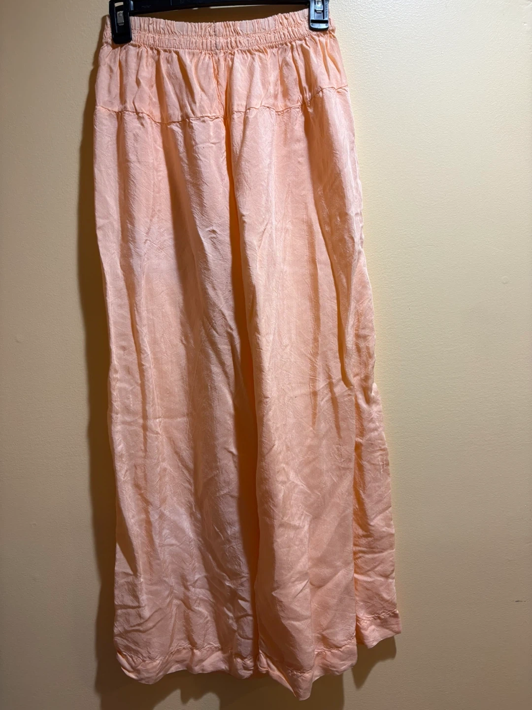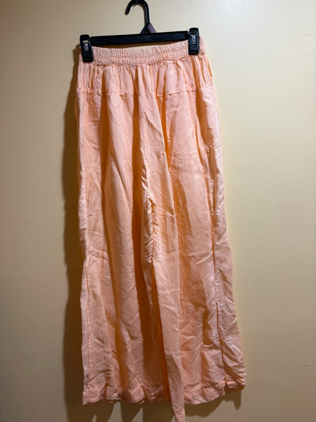These flowy wide leg pants are a lovely peach color. They feature an elastic waistband for comfort. The material has a slightly crinkled texture.