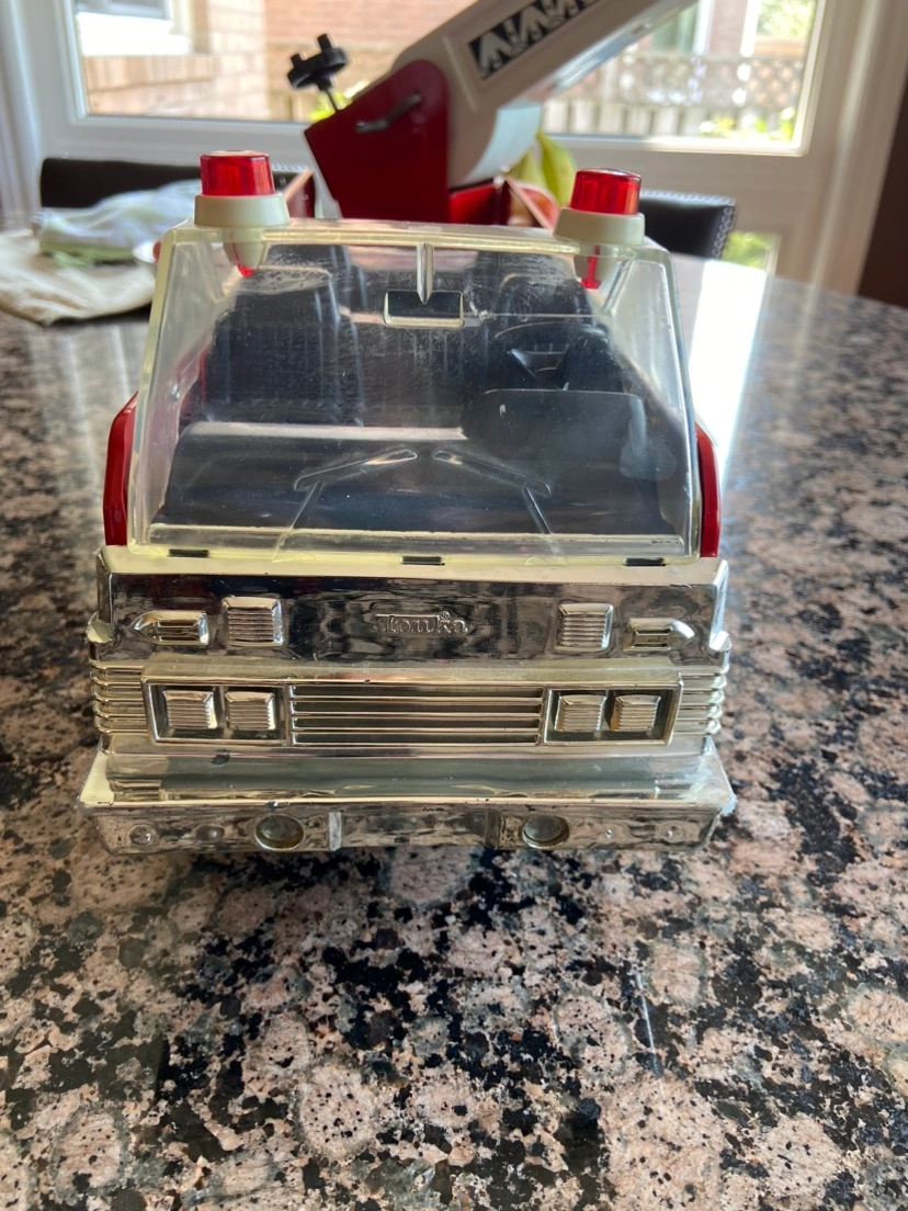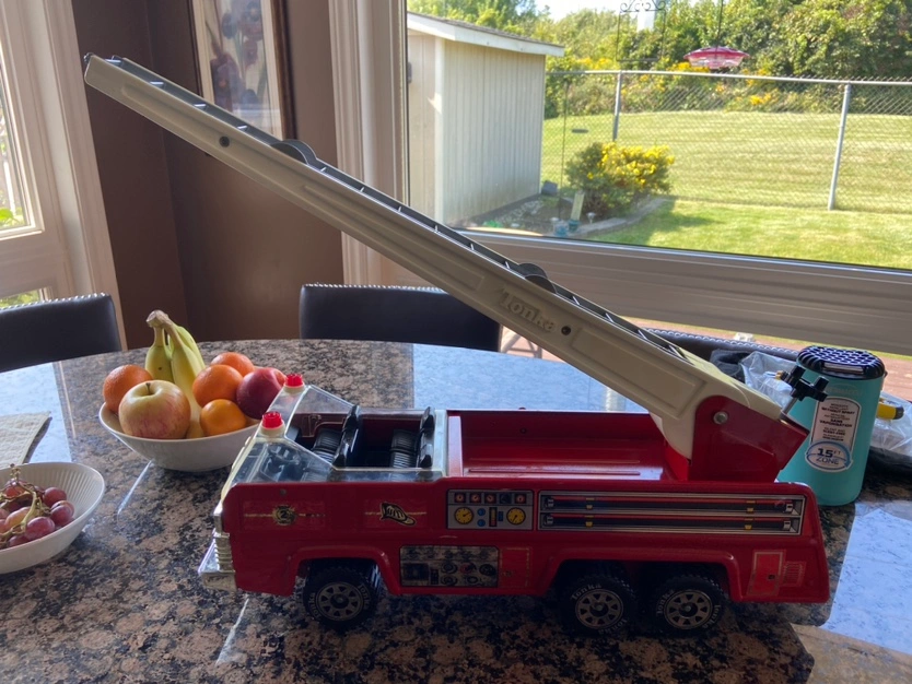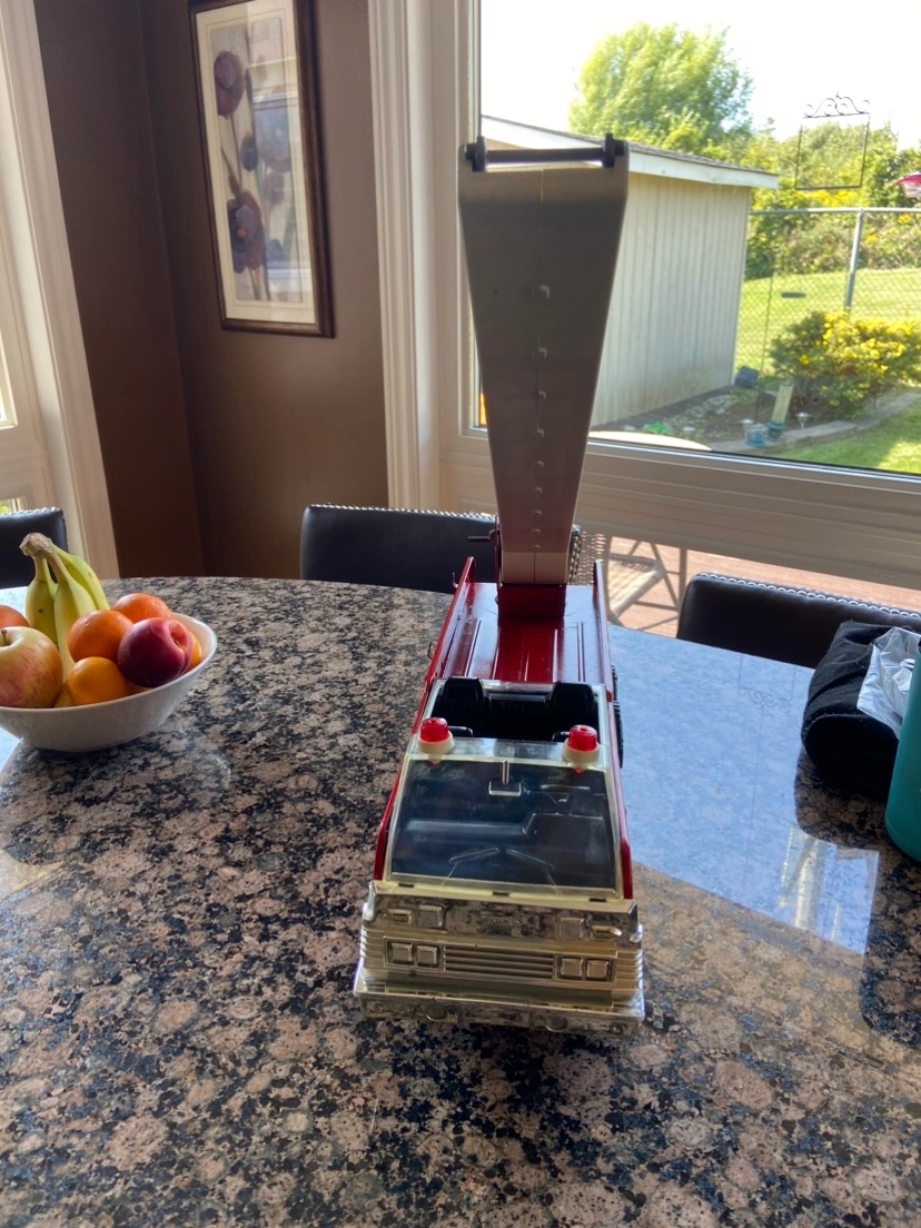 Vintage Tonka fire truck with working ladder. It’s about 35 years old and in great condition except missing side ladder.
