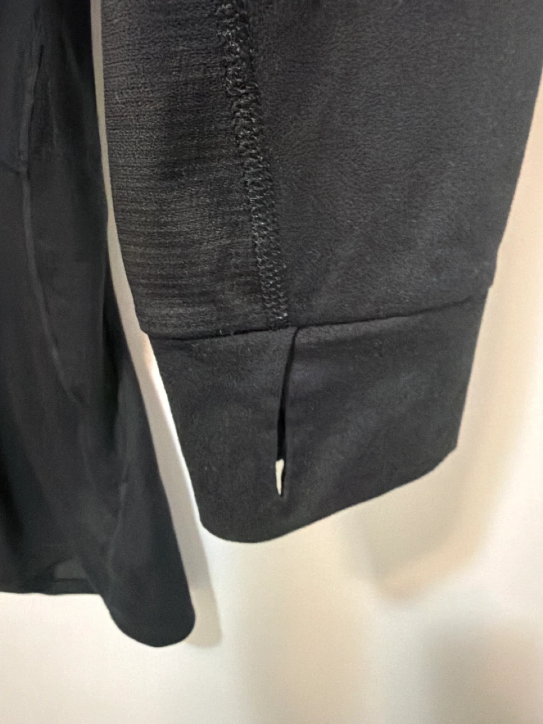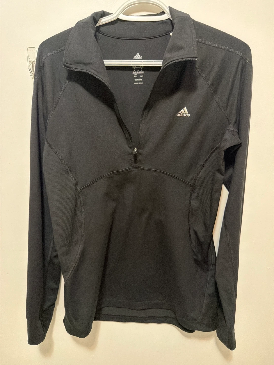 Black Adidas long-sleeve shirt with quarter-zip neckline. It's made with Climalite fabric for moisture-wicking. Size is medium.
