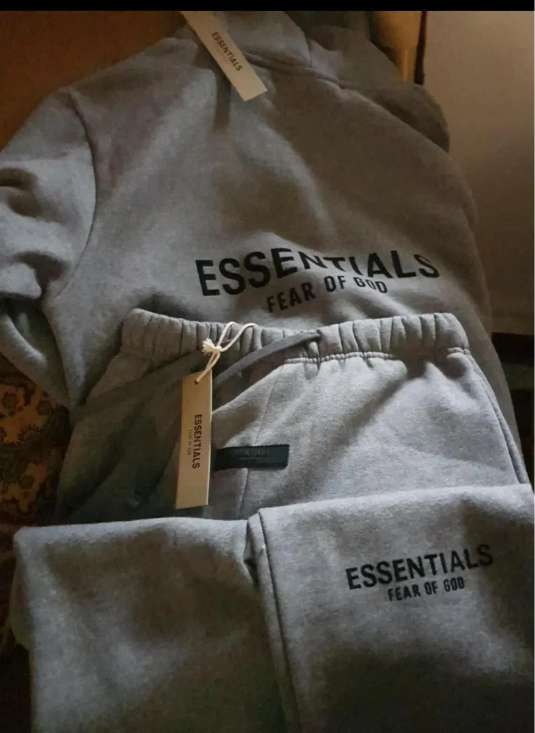 This is a grey hoodie and sweatpants set from Fear of God Essentials. Both pieces have the 'Essentials Fear of God' logo printed on them. Made from a comfortable material, it's perfect for casual wear. The set includes a hoodie and matching sweatpants.