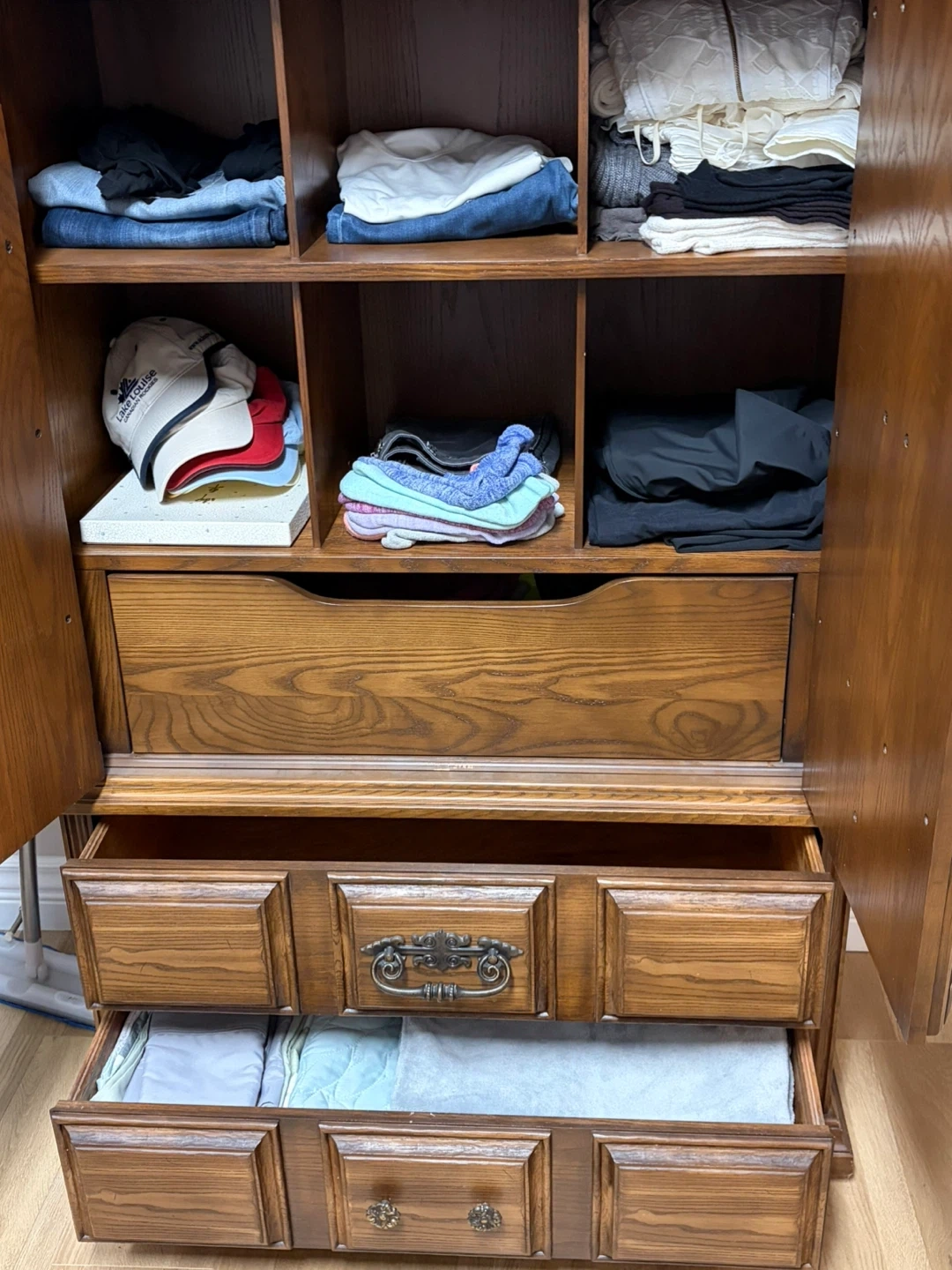 Extremely well loved solid oak wardrobe in excellent condition. It has 6 compartments and 3 drawers for ample storage. Dimensions are 39" wide, 56" tall, and 18" deep.
