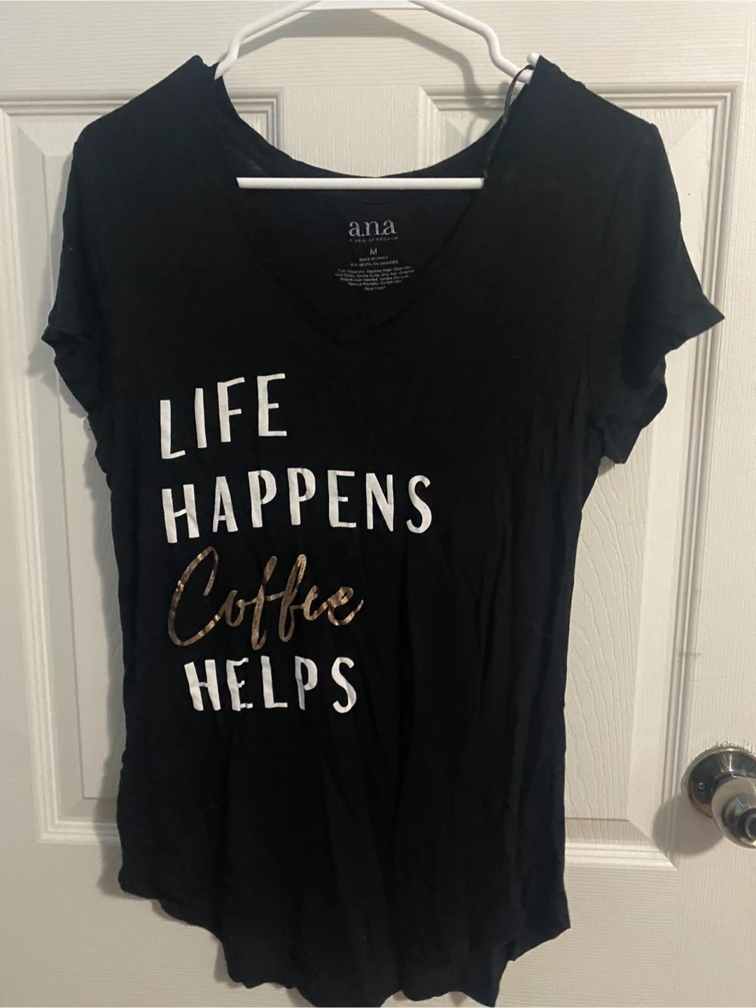 This is an ANA graphic t-shirt. It's black with a V-neck and short sleeves. Size medium. Features the text 'LIFE HAPPENS Coffee HELPS'.