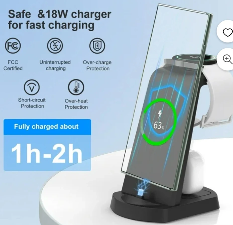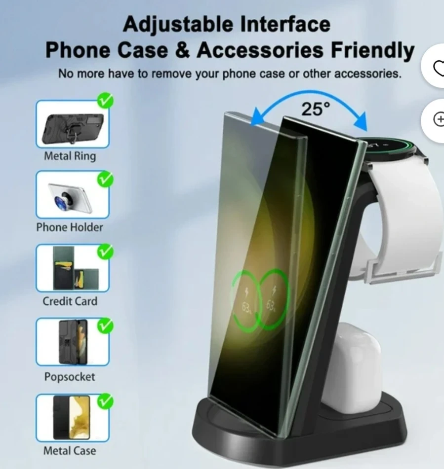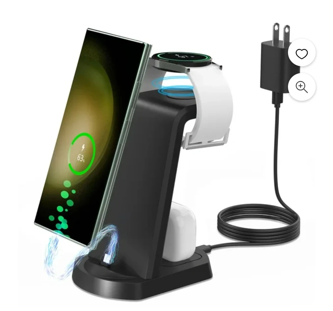 This is a 3-in-1 wireless charger stand for your phone, watch, and earbuds. It comes with a Type-C cable and a 9V/2A power adapter. It is compatible with phone cases and accessories.