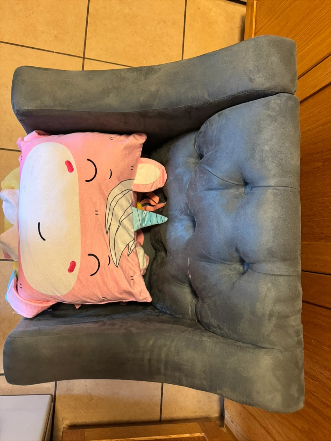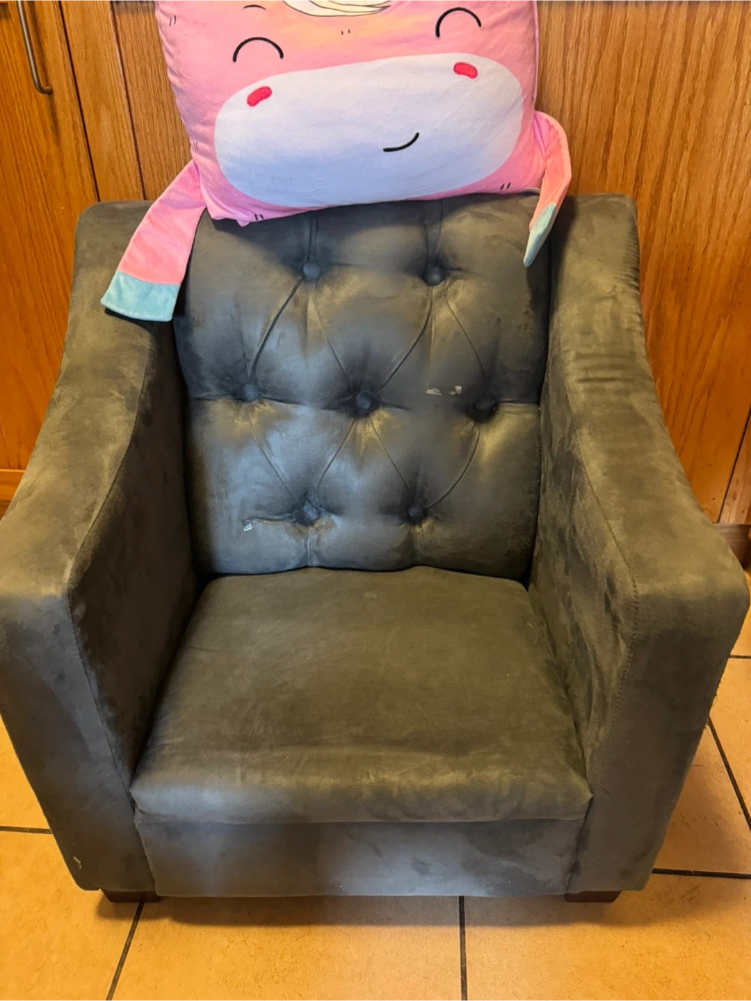 Selling a cozy grey upholstered armchair, kid size. It's in good condition and would be a great addition to any playroom or a living room or bedroom for the tiny one. Pillow and seat covers come with it.