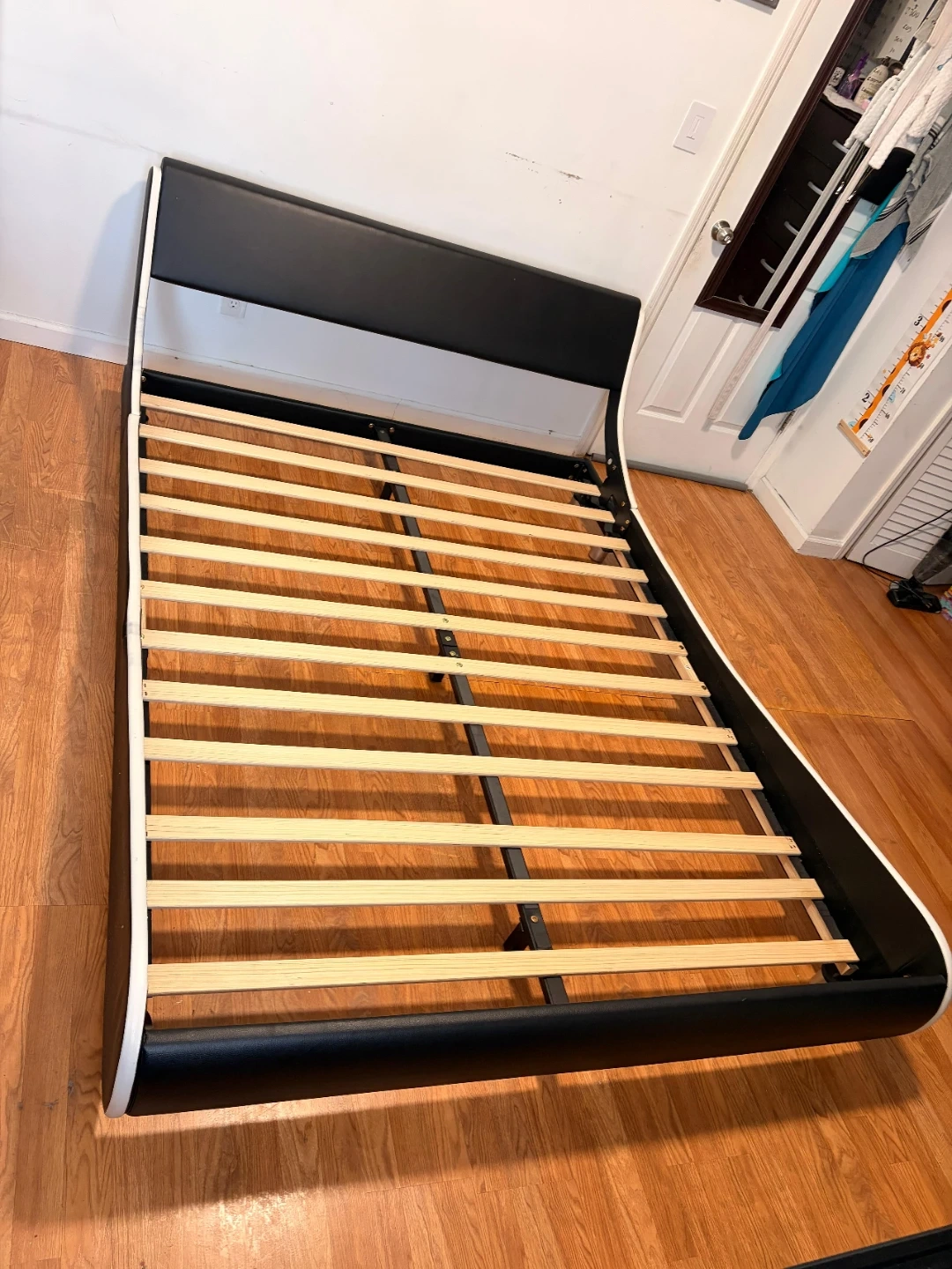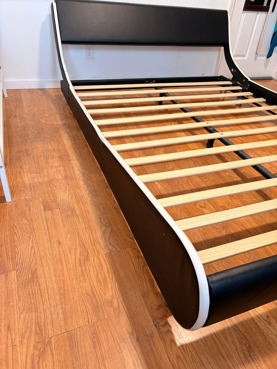 Queen size bed frame with a black faux leather finish and white piping. It features a curved headboard and footboard design with durable wooden slat support. This frame is built for lasting comfort and style in your bedroom!