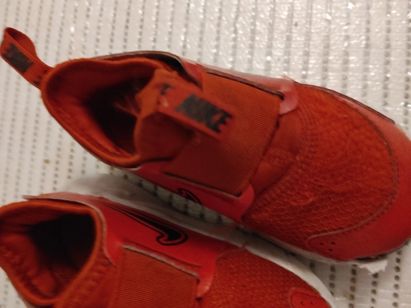 These red Nike slip-on shoes are designed for toddlers. They feature a convenient pull tab at the heel and a secure elastic strap across the top. The soles offer good grip. They're great for active little ones on the go!