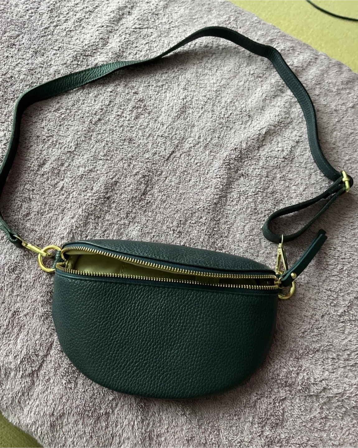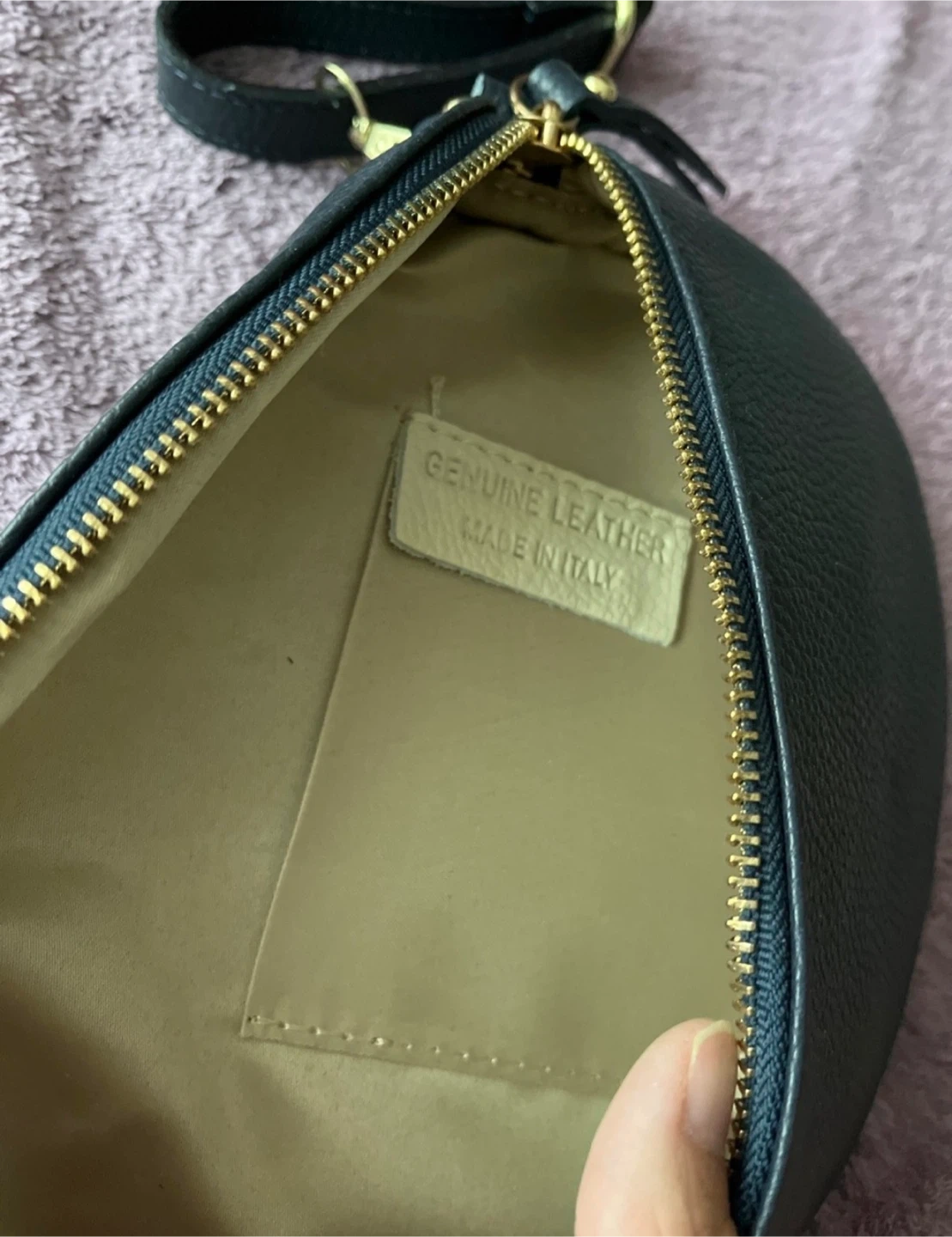 This dark blue crossbody bag is made of genuine leather and was crafted in Italy. It has a zippered closure and a removable strap. It's a great size for everyday essentials. I bought it impulsively but don’t need it. Never used.