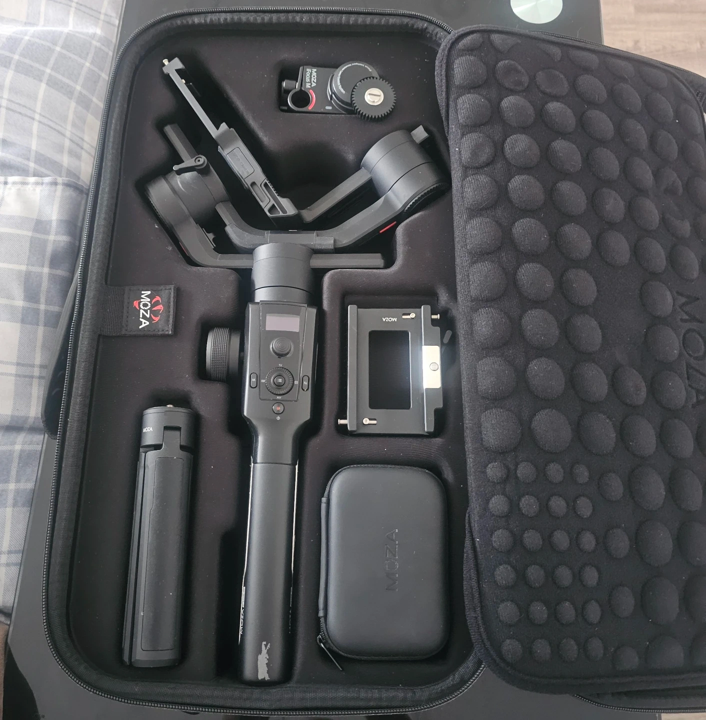 This MOZA Air 2 gimbal stabilizer comes in a protective carrying case. It's designed for professional camera stabilization. Includes various accessories for mounting and operation.
