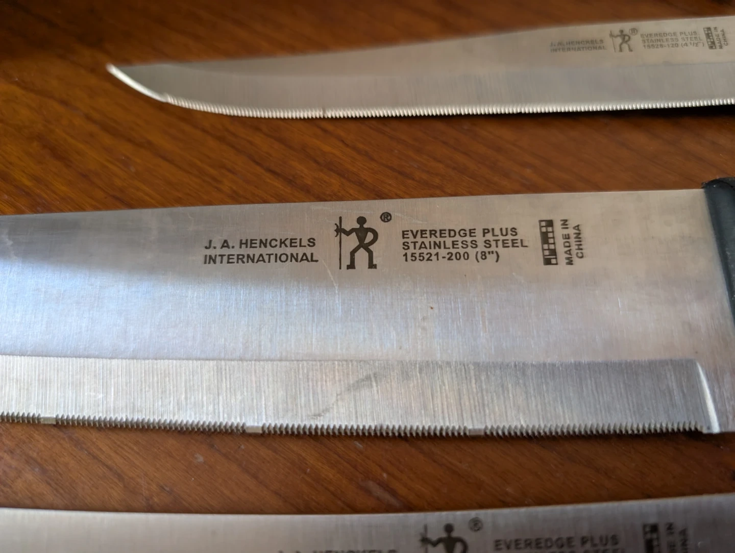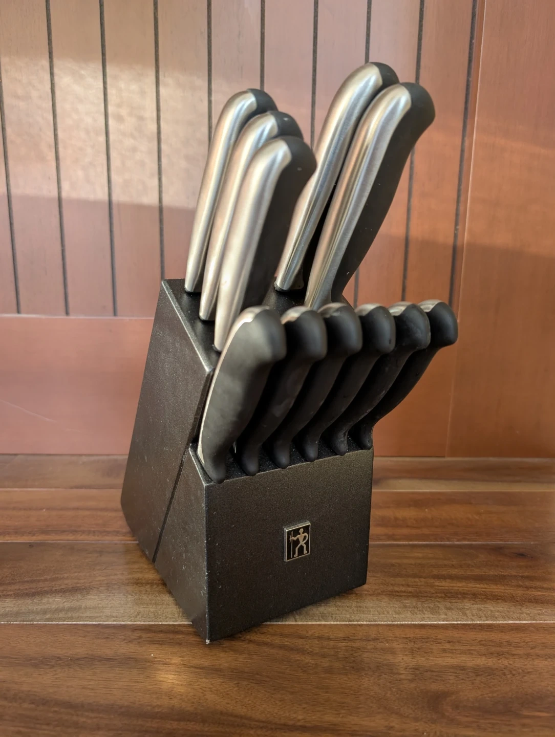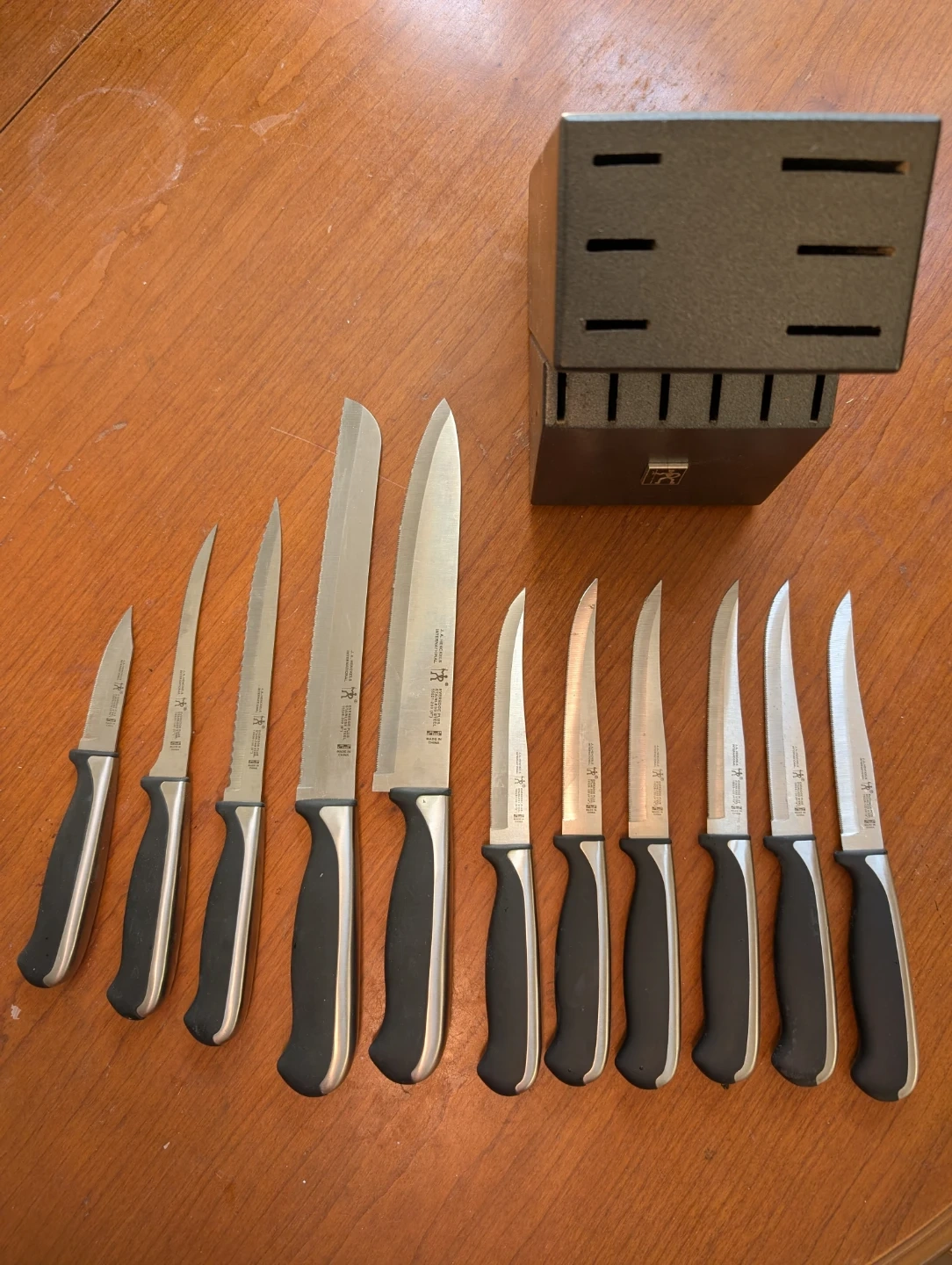 J.A. Henckels International stainless steel knife set in excellent condition. Only the steak knives were used regularly. This Everedge Plus line is micro-serrated so that you never need to sharpen it. It only came with 11 knives even though the block has space for 12.