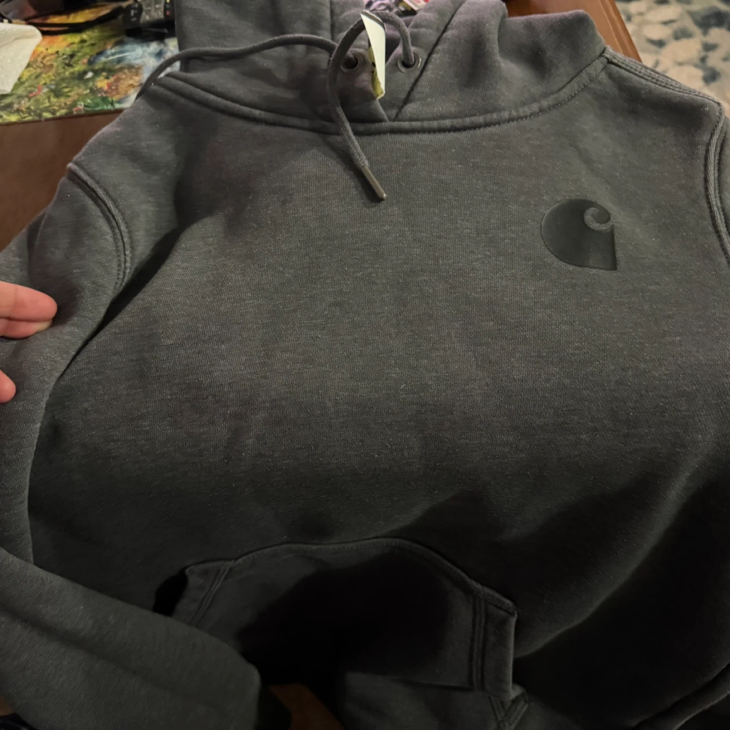 This is a Carhartt relaxed fit hoodie in charcoal grey. It's size XS and made of a soft cotton blend. The hoodie features a front pocket and a drawstring hood. Built to serve and protect hardworking people!