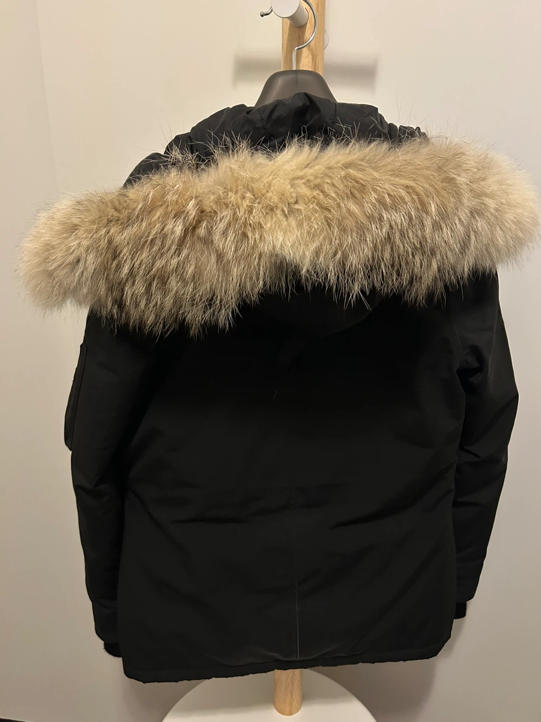 Canada Goose Montebello parka in black. Features a fur-lined hood and multiple pockets. Size M in great condition. Only worn for 1 season.