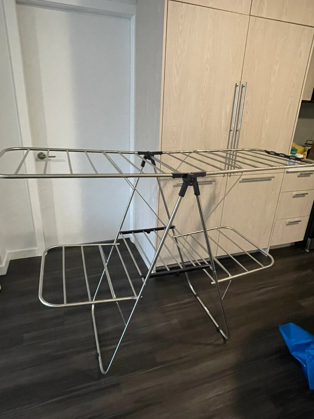 This is a collapsible metal drying rack with multiple tiers for hanging clothes. It's easy to set up and fold away for storage.