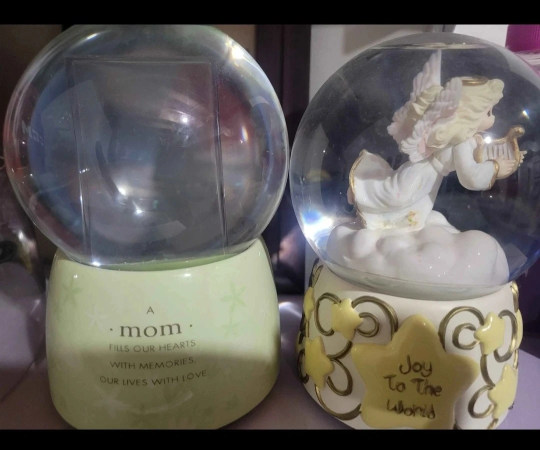Two decorative snow globes. One globe features an angel playing a harp with "Joy To The World". The other globe is a photo frame style globe with "A mom fills our hearts with memories, our lives with love".