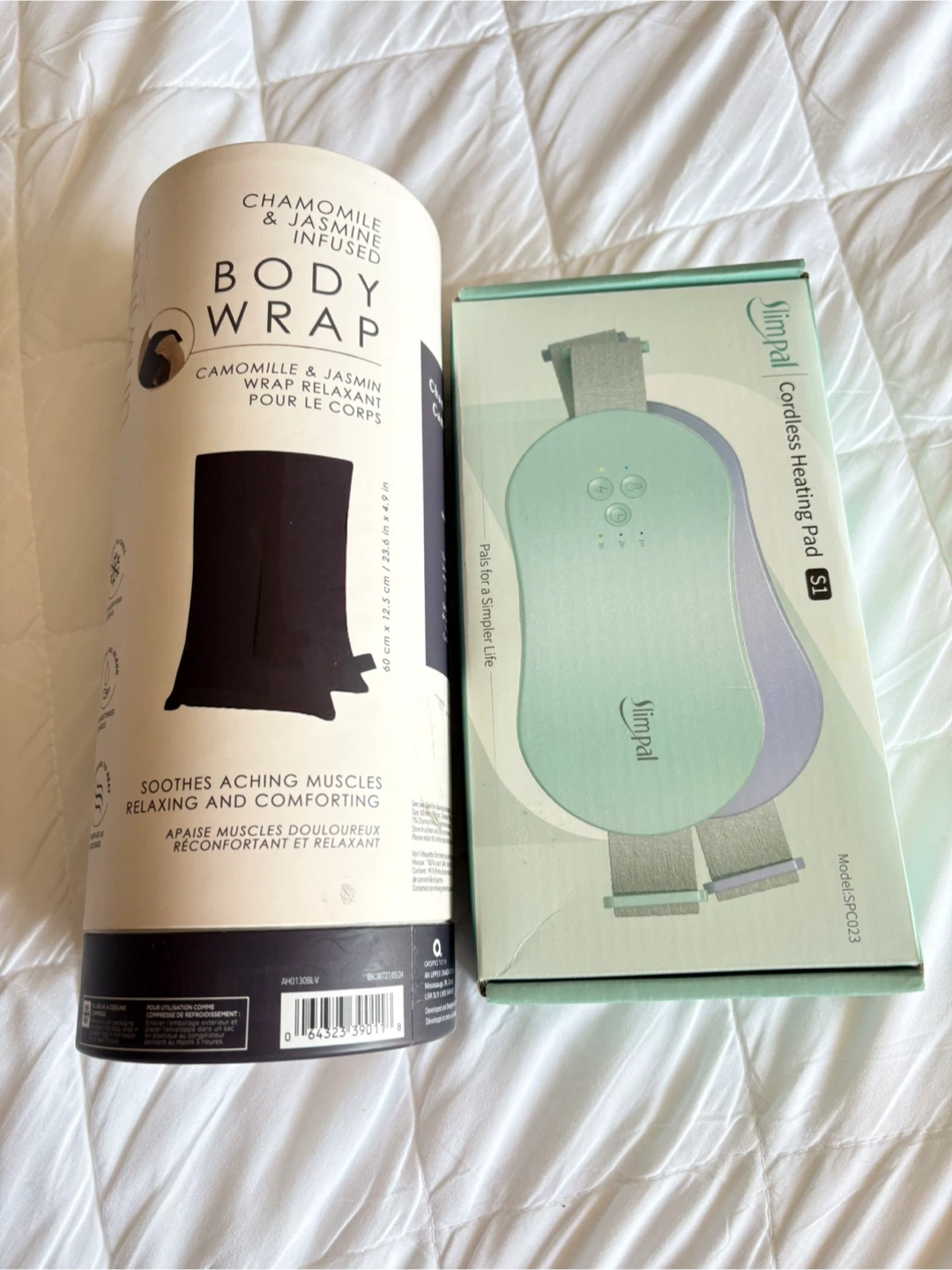This bundle includes a Slimpal S1 cordless heating pad for soothing relief and a chamomile & jasmine infused body wrap. The wrap is designed to soothe aching muscles and provide comfort. Both items are great for relaxation. Dimensions for wrap: 60 cm x 12.5 cm.