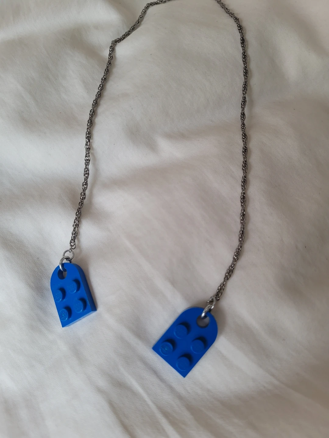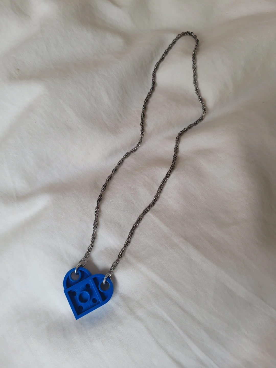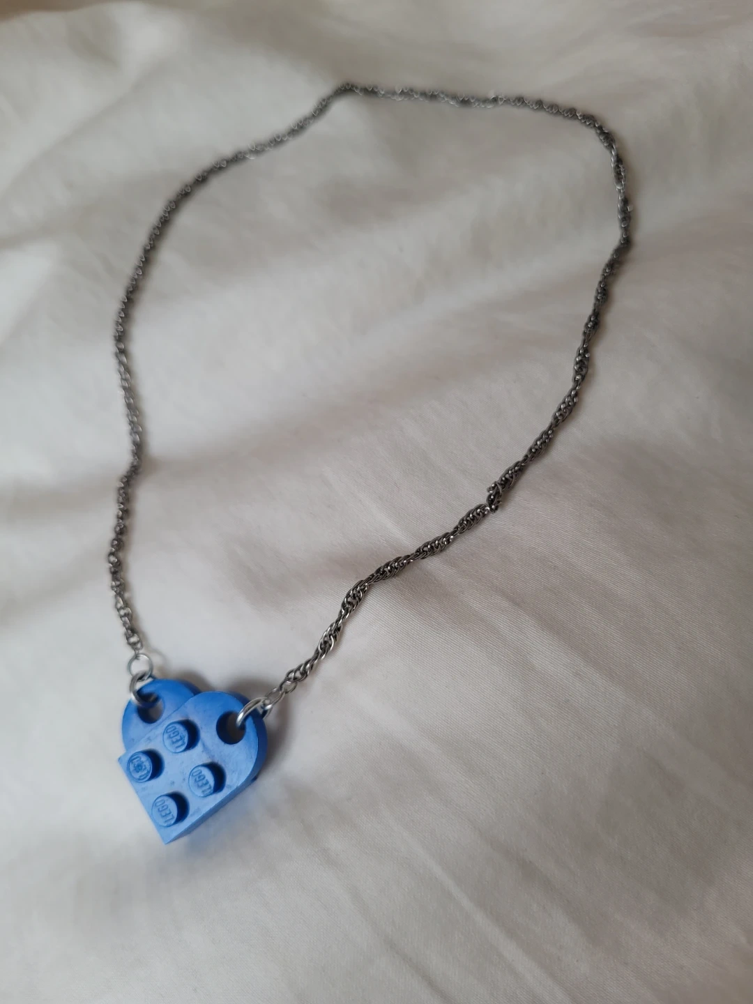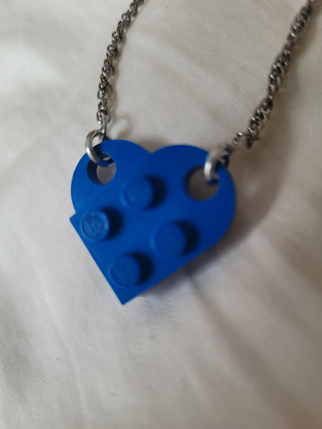 Fun for all ages!! Perfect condition to sell, yet giving for FREE to the community! 🧡 This is a unique necklace featuring a blue heart-shaped charm made from a Lego brick. It's attached to a silver-toned chain. The charm has the classic Lego stud pattern.